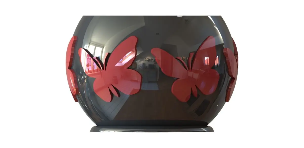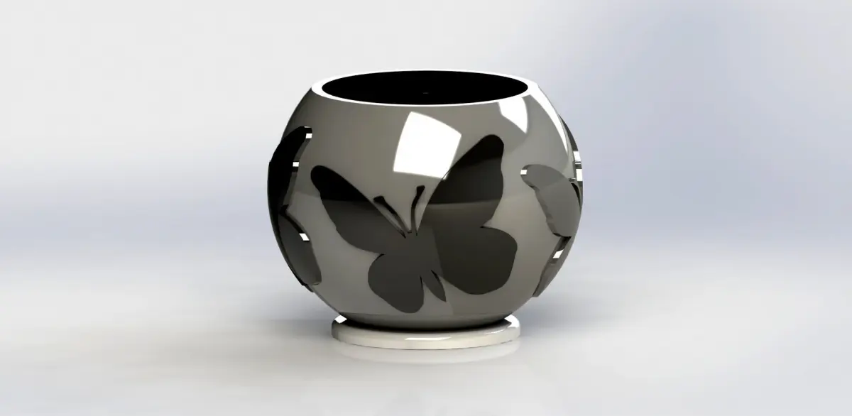 BUTTERFLY VASE A nice decorative piece for the garden or interiors with beautiful engravings of butterflies. High: 80 mmTop diameter: 100 mmWall Thickness: 2 mmBase Diameter: 80 mmBase Thickness: 5 mmHole diameter to filter water: 4 holes of 4 mmThickness of butterflies: 2 mm