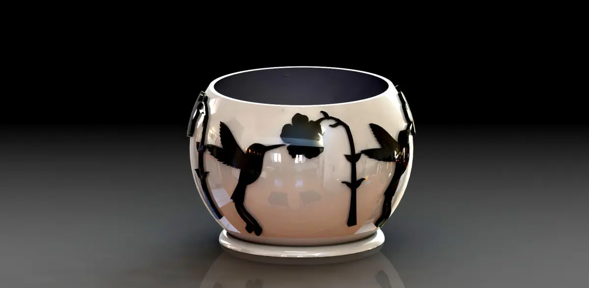 HUMMINGBIRD VASE A beautiful vase as a decorative piece for your garden and as a tribute to the natural beauty of these beautiful birds.High: 80 mmTop diameter: 100 mmWall Thickness: 2 mmBase Diameter: 80 mmBase Thickness: 5 mmHole diameter to filter water: 4 holes of 4 mmThickness of butterflies: 2 mm