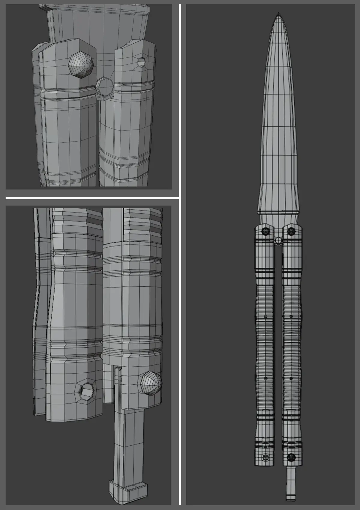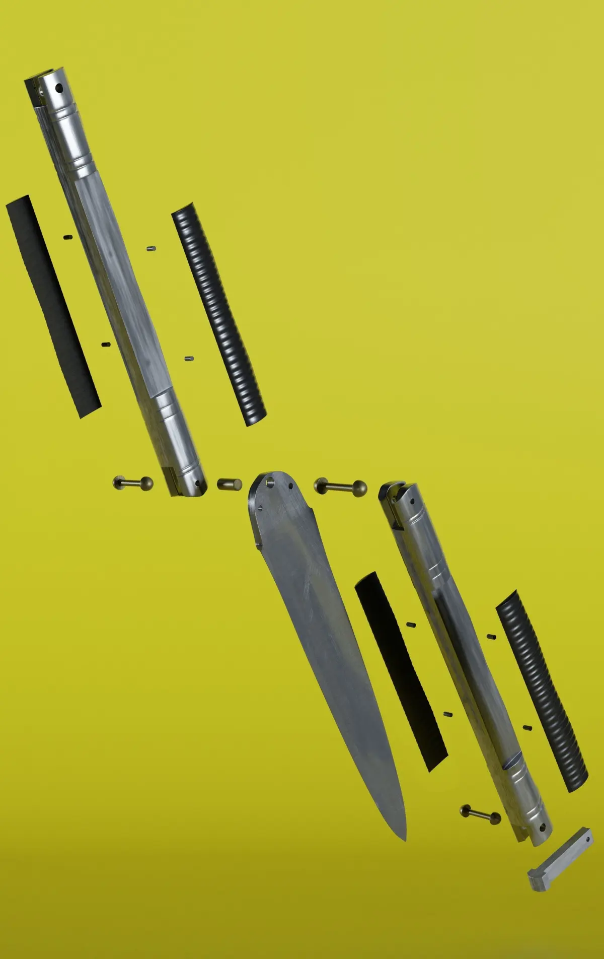 The model consist of several parts : Blade, bite handle, pivot pins, tang pins and latch.