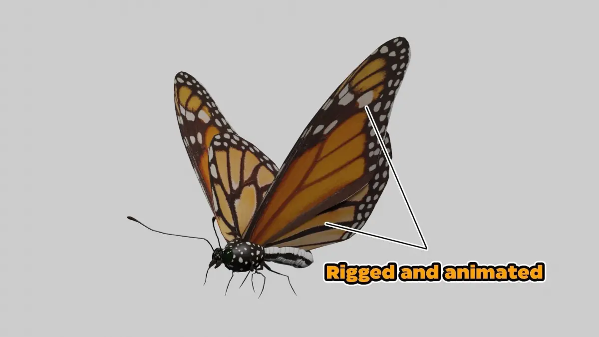 Butterfly low poly 3d model made in Blender 2.93.4 Preview images are rendered in EEVEE engine,The type belong to Monarch group, . . . Blend,ABC,dae,obj,mtl,fbx formats are included, texture,roughness,bump and metallic maps are included.This model is rigged and the animation files also included.Please do review my channel :)