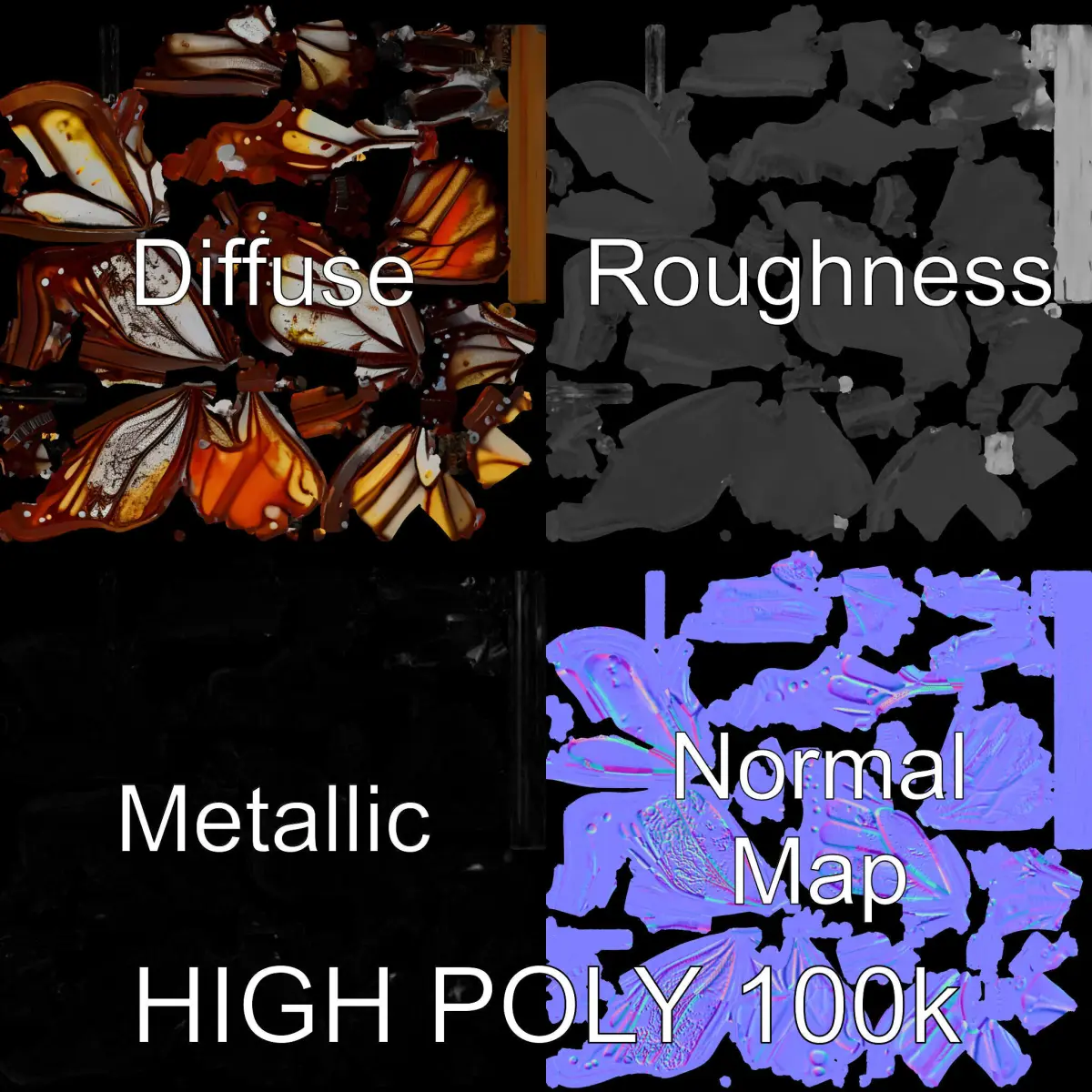 This Butterfly Ornament 3D Model Pack features a stunningly detailed representation of a decorative butterfly made of metal. With three levels of detail, it is suitable for mobile applications, detailed environmental scenes, and high-quality production rendering. This model can be used effectively in garden-themed visualizations, nature documentaries, or animated sequences. Its PBR textures, including Diffuse, NormalMap, and reflection/roughness/metallic, ensure compatibility with all modern rendering engines. All textures are 4096x4096 in size, and models are unwrapped with no overlapping UVs. The first image is the reference used for creating the 3D model. It is important to carefully evaluate the quality of the model by examining the preview images that display the topology and polygonal mesh. These previews (WIRE and WEB 3D Preview) clearly demonstrate how accurately the model matches the original reference and how well the geometry has been executed. If you like the model, please remember to like and leave a comment!
