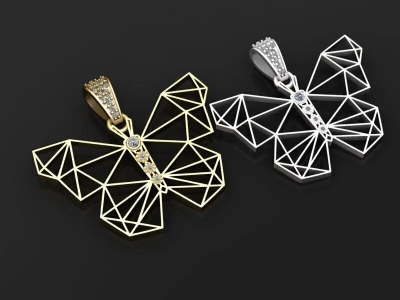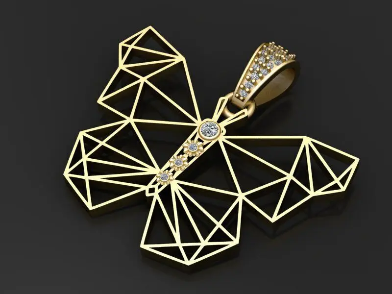 This exquisite pendant showcases a geometric butterfly design crafted in high-polish gold. The wings are delicately structured with a modern openwork lattice pattern, giving the piece a contemporary, airy elegance. The butterfly's body is adorned with a vertical row of sparkling round-cut diamonds, gradually sized for balance and brilliance. The bail is encrusted with shimmering diamonds, enhancing the pendant's luxurious appeal. A perfect blend of nature-inspired beauty and architectural sophistication, this pendant is a statement of grace and modern artistry