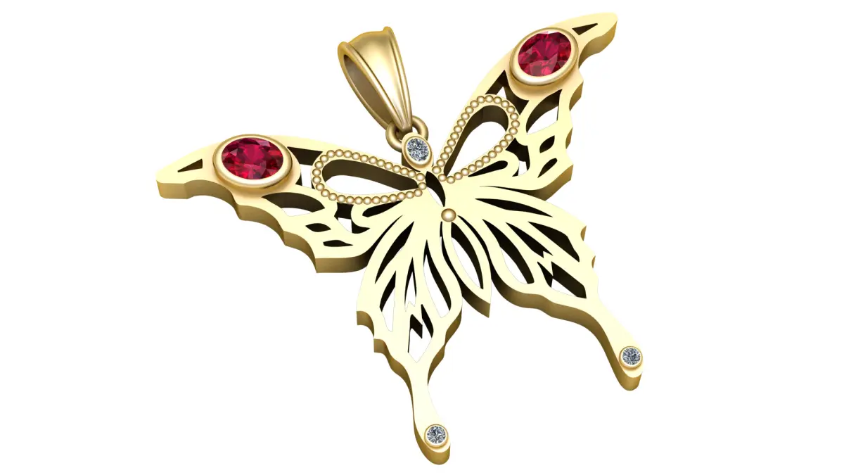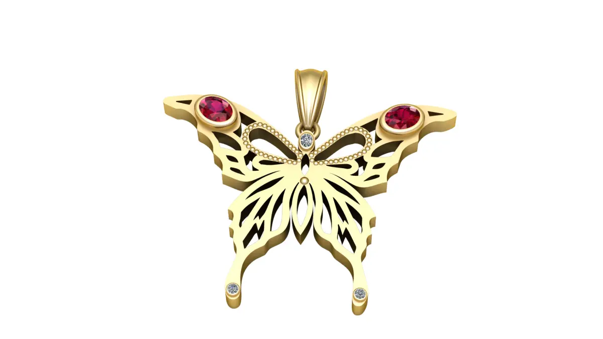 Delicate Butterfly Pendant masterfully crafted in polished yellow gold, embodying grace, transformation, and elegance. The openwork wings feature intricate cutouts enhanced with fine detailing, while vibrant round-cut red gemstones are set on the upper wings, adding a striking splash of color. Brilliant white gemstones are placed at the antennae and lower wing tips for a subtle sparkle. The refined design and flawless craftsmanship make this pendant a perfect choice for nature lovers or as a meaningful gift symbolizing beauty, freedom, and new beginnings.