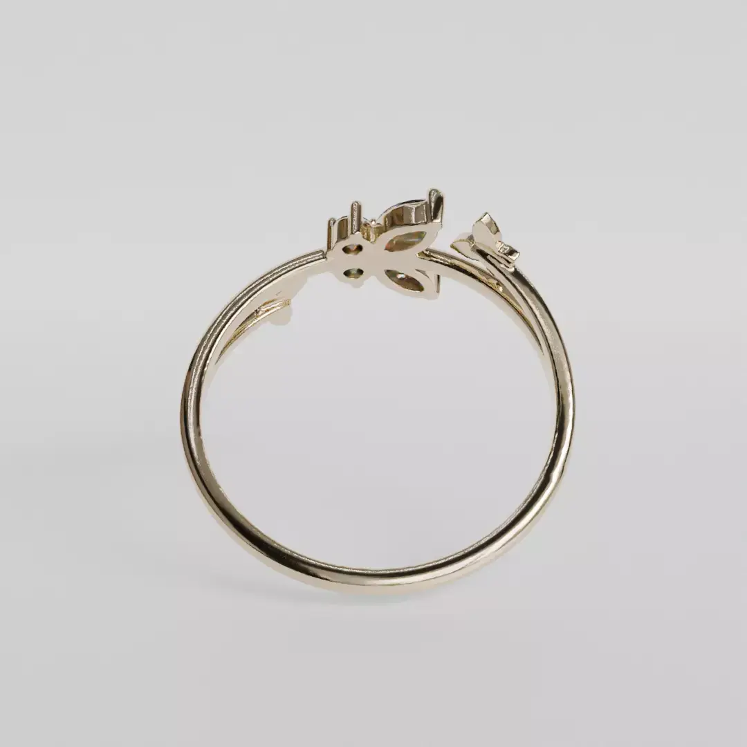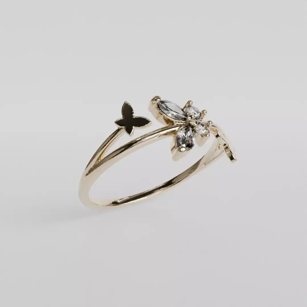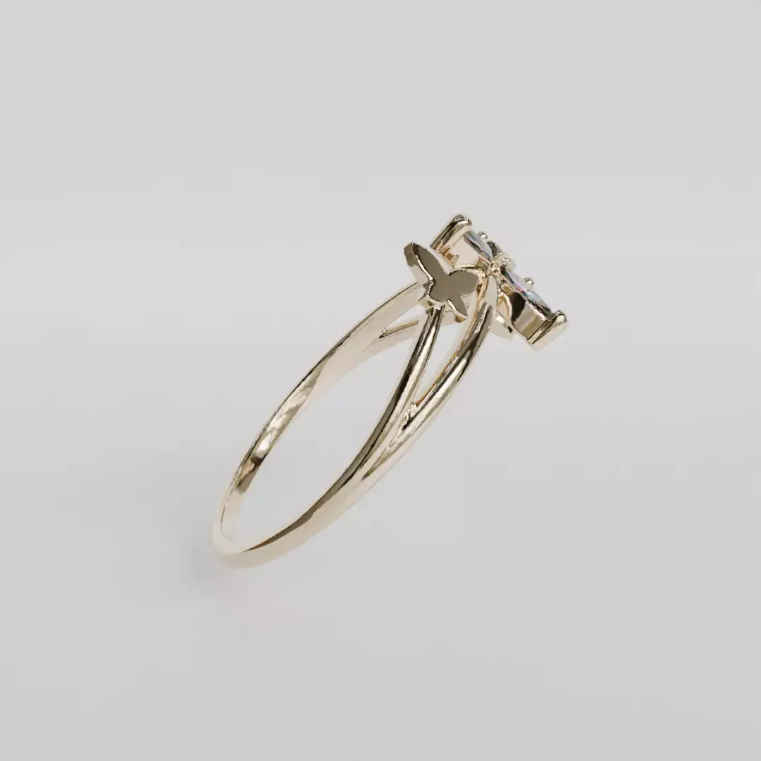 Butterfly ringUS size 6 1/2Slim, feminine ring with three butterflies, two of them plain and the center inlaid with two 4 x 2 mm zircons or marquise diamonds and two 1.75 mm diameter zircons or diamonds.