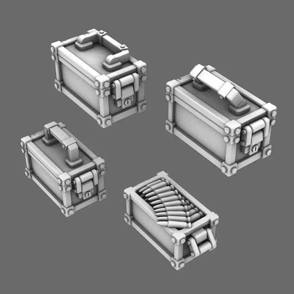 Check out our BWTF Scenics Ammo Boxes. These come with intricate 3D designs that make painting a breeze. This product features 4 variations. There are three closed versions with handles in different positions, and one is open with an ammo belt. This product is suitable for your favorite 28mm-scale Grim Dark-themed Superhuman Armored Warrior of Humanity models, such as a Battle Brother Master.