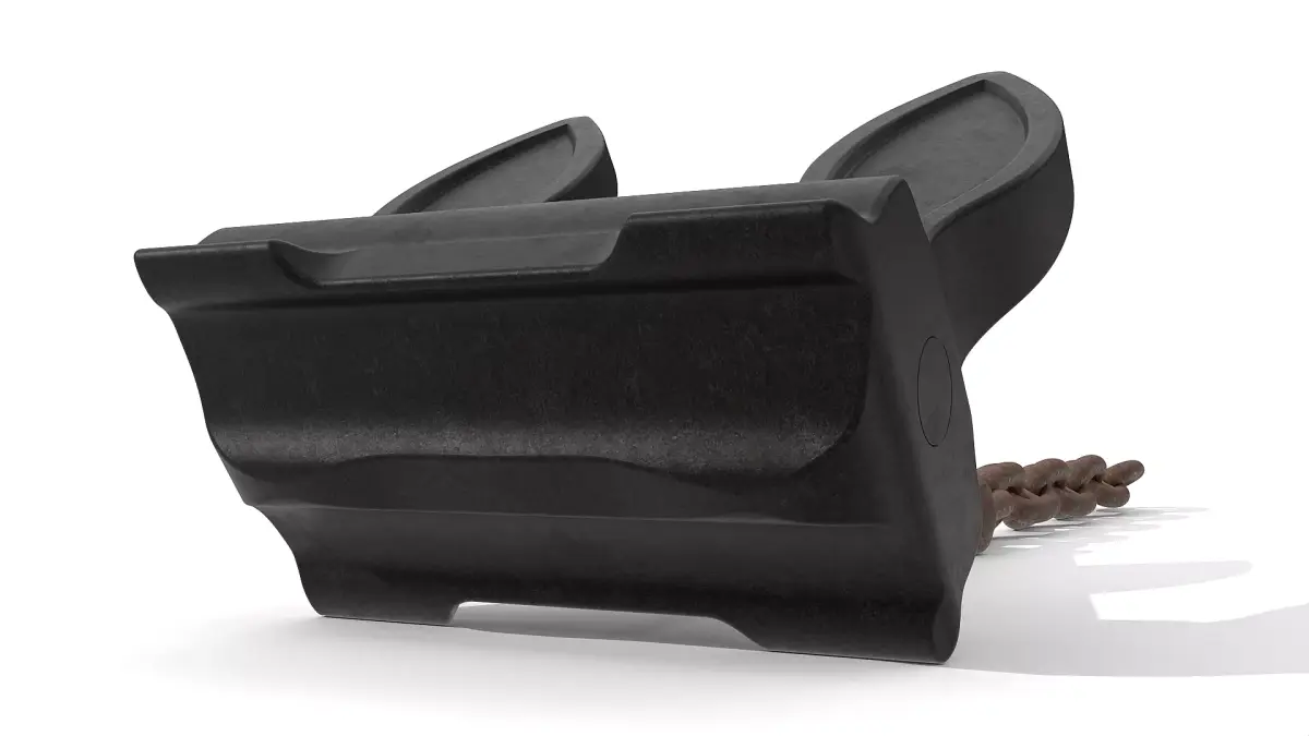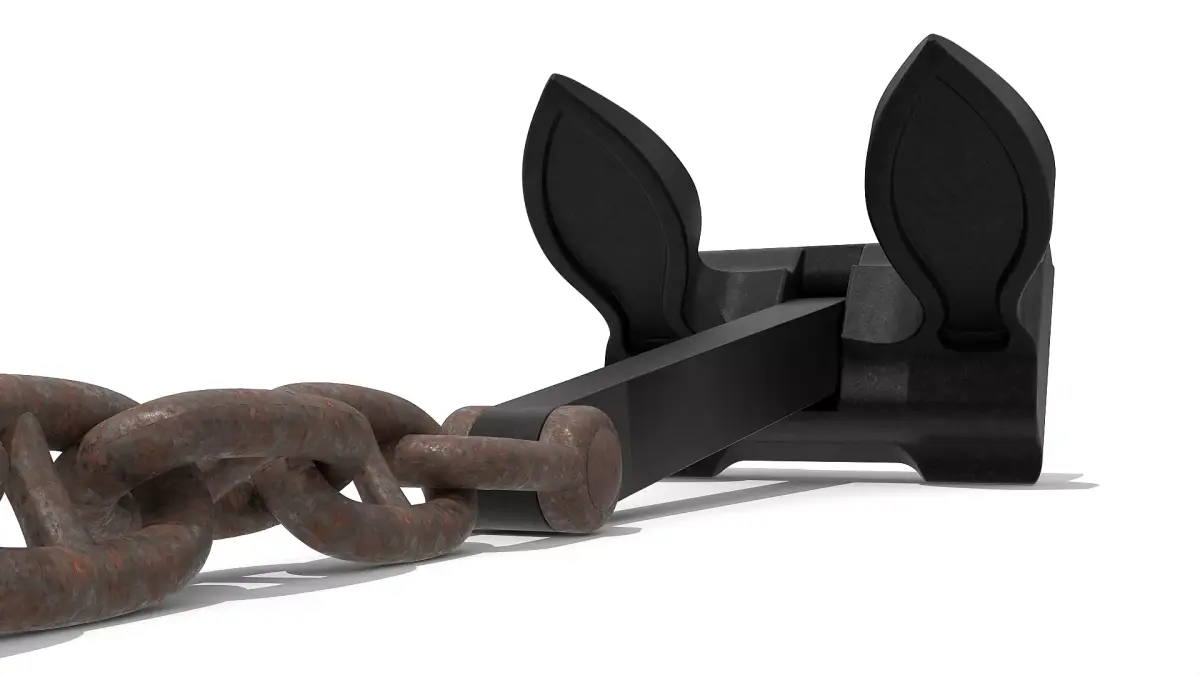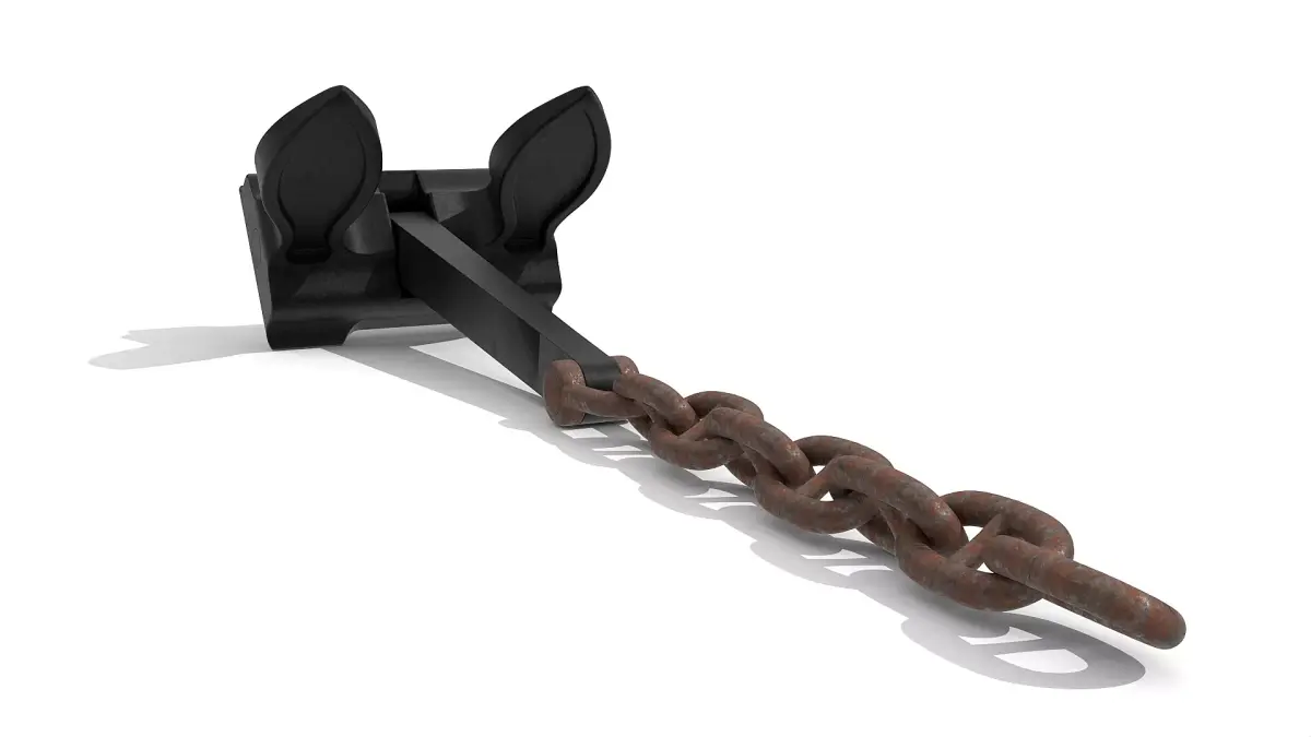Detailed model of a big byers ship anchor, scaled 1:1. Byers anchors are widely used on cargo ships and tankers. Their stockless design allows them to be pulled flush into the ship's hawse pipe, which is essential for streamlined modern hulls. They are most effective in soft, muddy, or sandy seabeds where the flukes can easily penetrate and create resistance. Byers anchors are produced in versions between 220kg and 20t. This model is a 10t version. A stud link anchor chain is a heavy-duty marine chain with a metal stud welded inside each link, preventing kinking and adding significant strength, making it ideal for large commercial ships and demanding anchoring tasks where durability and resistance to crushing under heavy loads are critical.