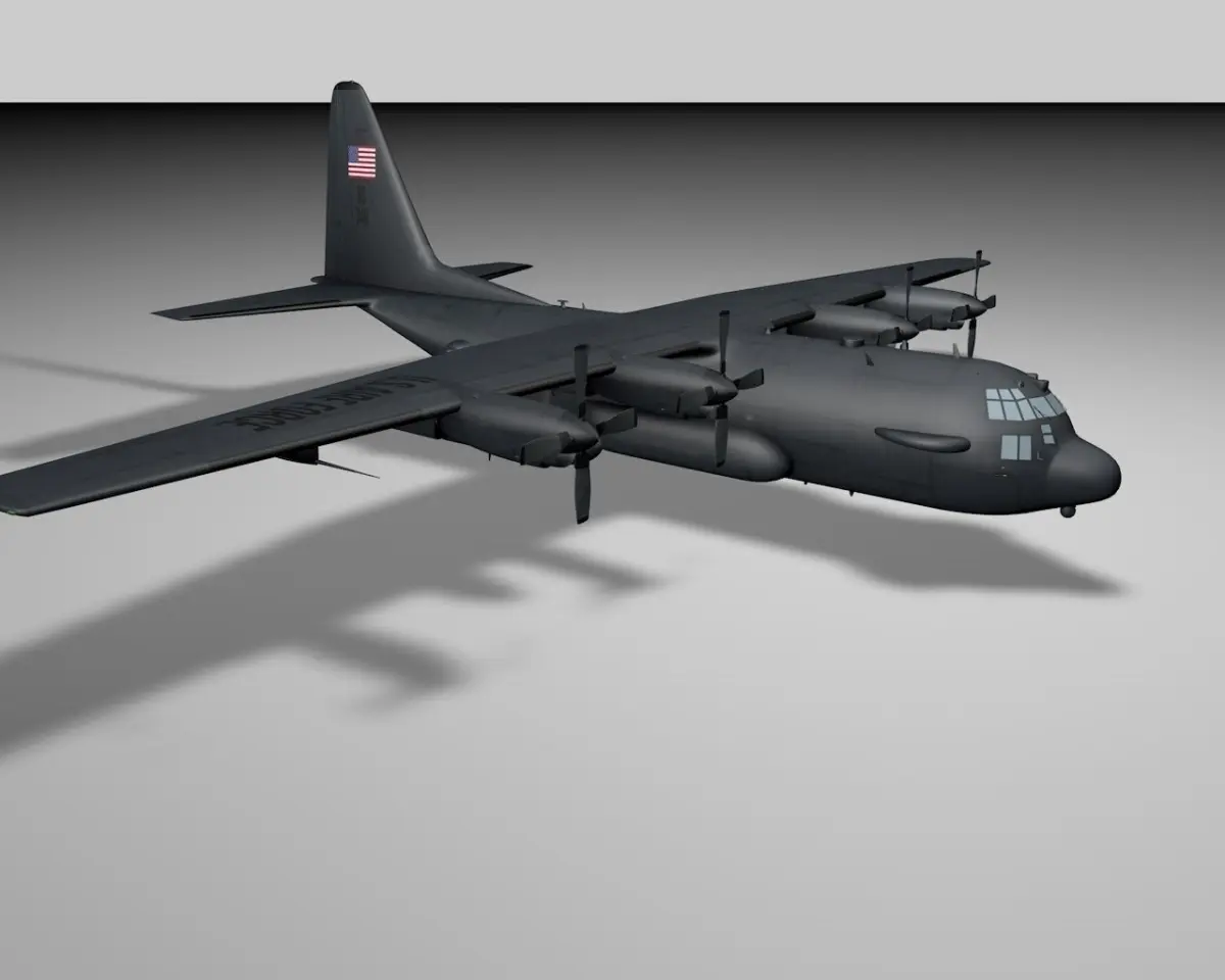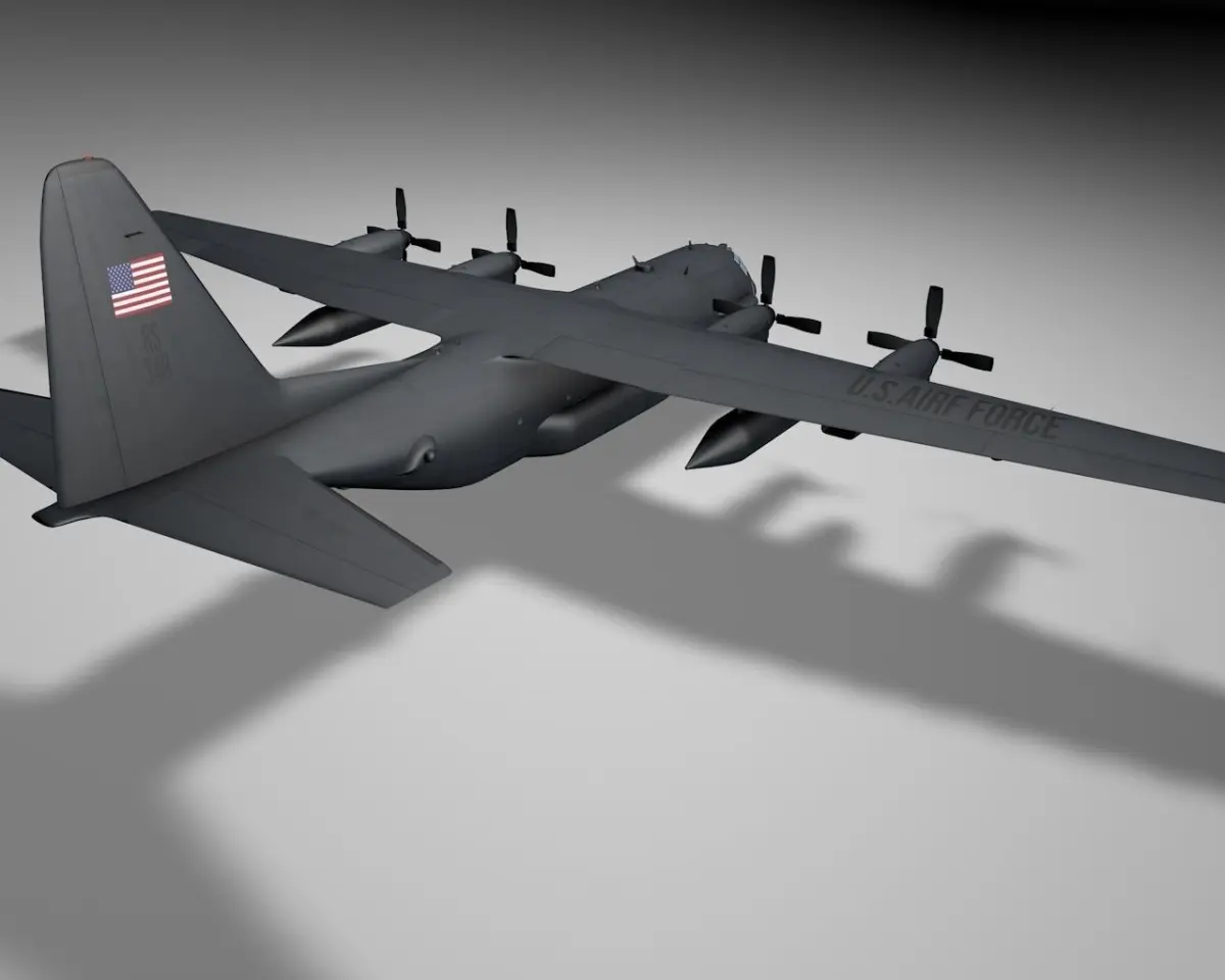The C-130 Hercules is a four-engine turboprop military transport aircraft. A highly detailed model of C-130 for USAF and it includes a cockpit with a pilot! 4k Textures also! . The model is originally made in Maxon's Cinema 4D.