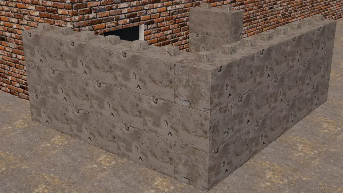 A modular prefab concrete block commonly used in military fortifications and large-scale landscaping projects. Each block measures 2 meters in length, 1 meter in width, and 1.2 meters in height. The design allows blocks to be placed adjacent side-by-side every 2 meters and stacked vertically every 1 meter. The system includes half-blocks as end pieces.