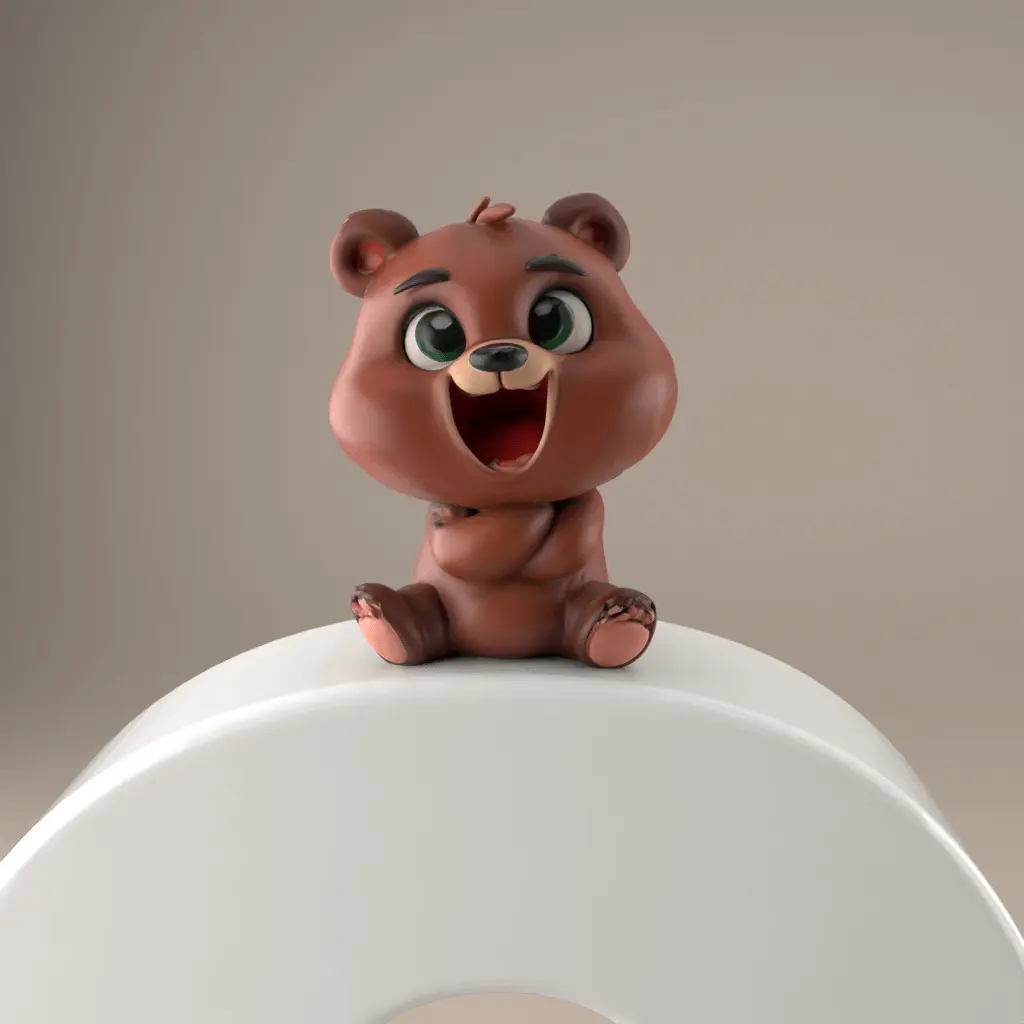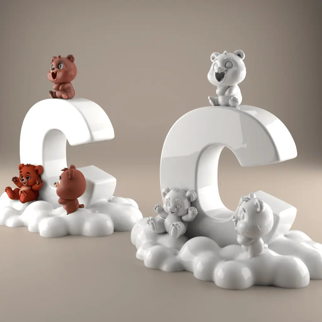 Design ConceptThis model features adorable bear characters interacting around a stylized letter 'C', set on a cloud base to add a whimsical touch.