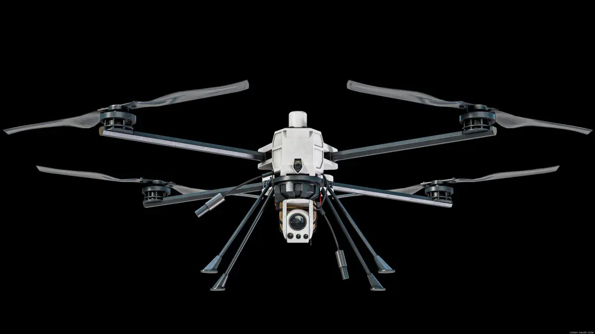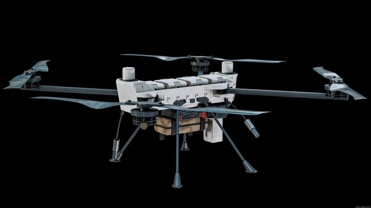 Super realistic high detailed PDW C100 Defense Heavy-Lift Military Quadcopter PBR System 3D Model with high resolution textures and PBR maps.