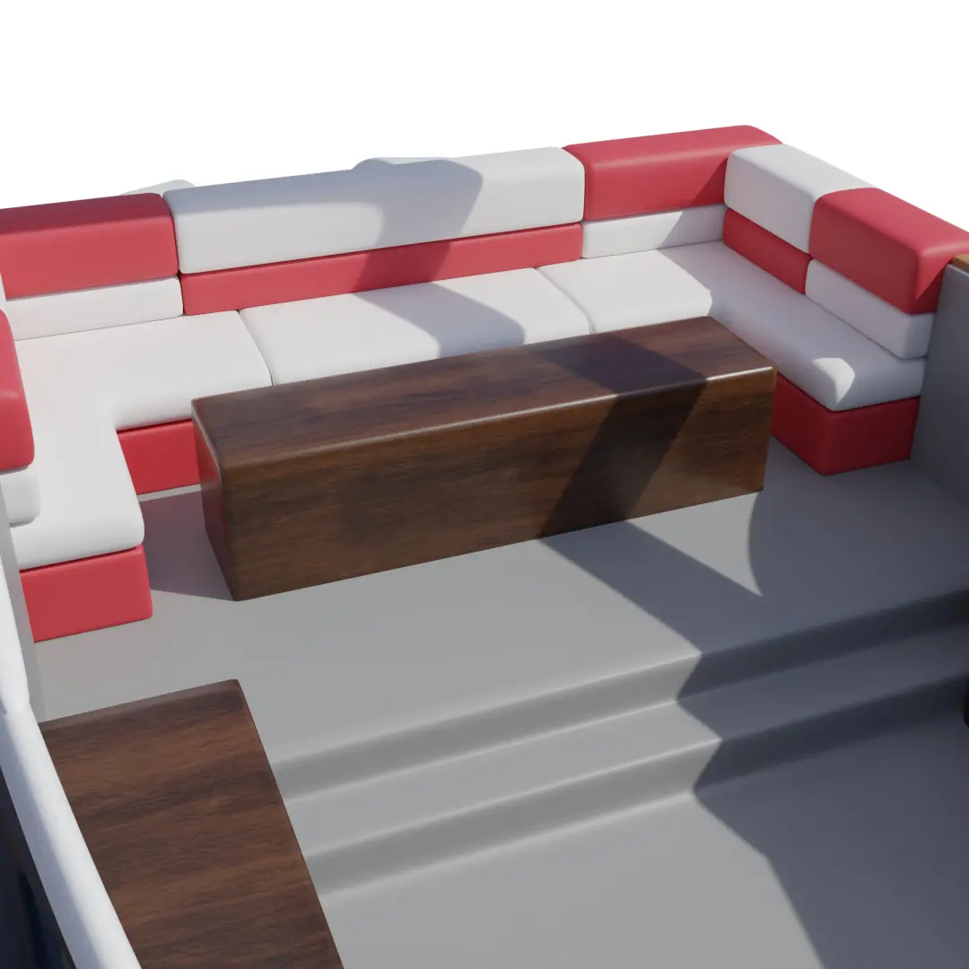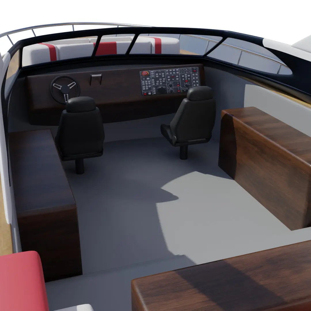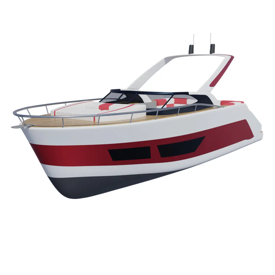 A sleek sport cabin cruiser with a bold red and white exterior, featuring a spacious deck for sunbathing and socializing, equipped with modern navigation technology and comfortable seating for leisurely cruises on the water, perfect for enjoying the current timeline's recreational boating activities.