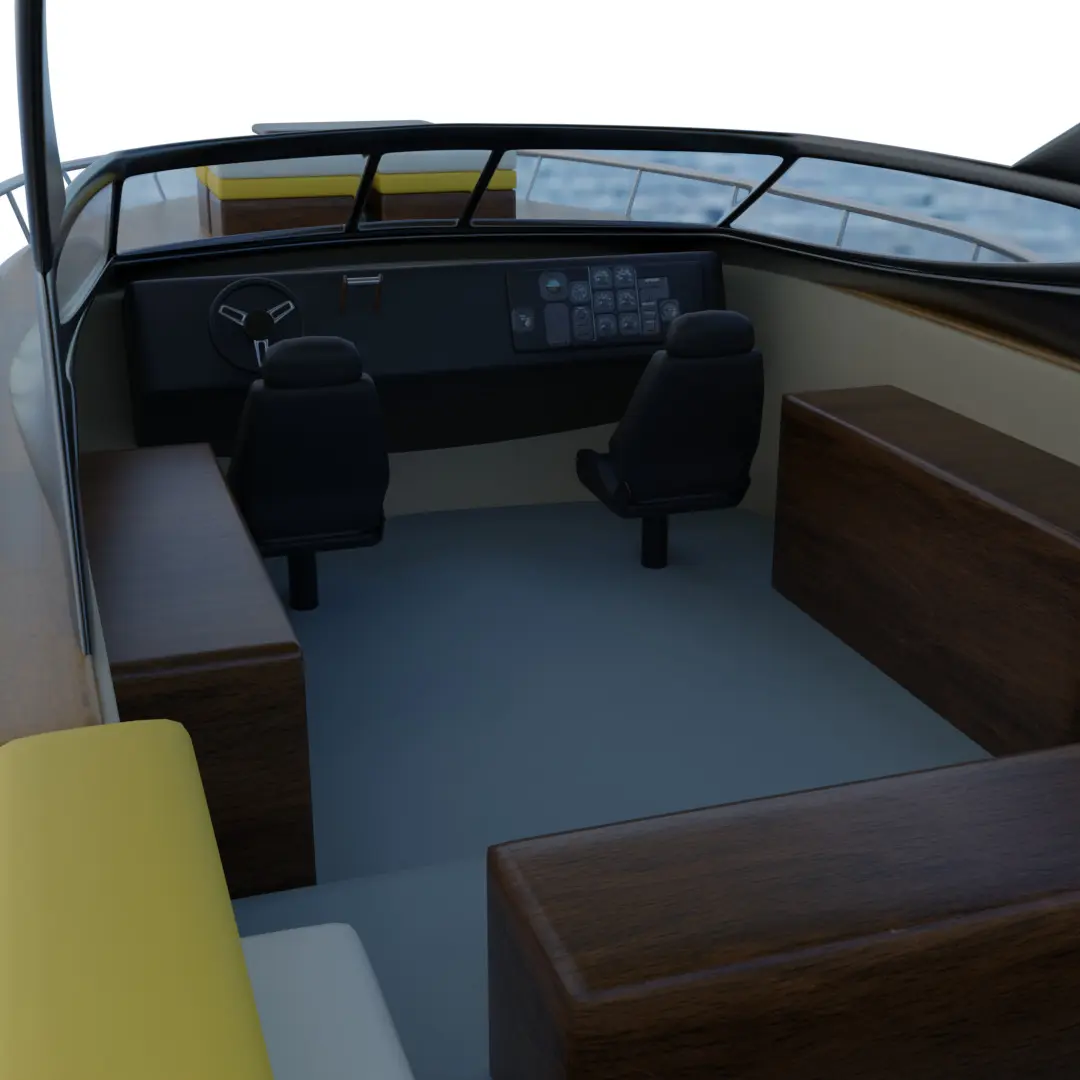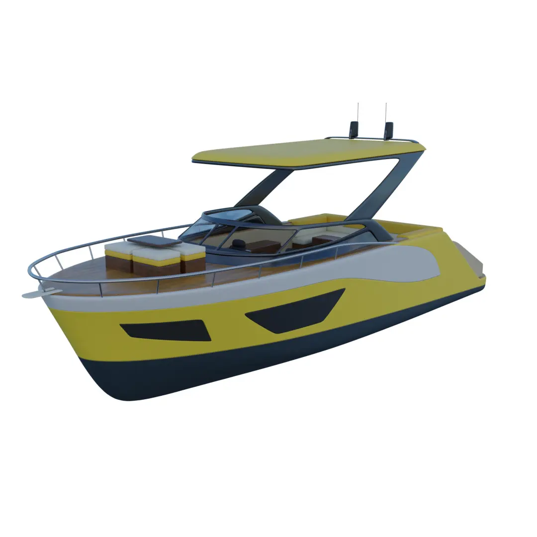 A stylish sport cabin cruiser in a vibrant yellow color, boasting a streamlined silhouette and teakwood accents, complete with a fully equipped kitchenette, cozy sleeping quarters, and a retractable canopy for alfresco dining experiences, offering a luxurious and contemporary boating experience in the current era.