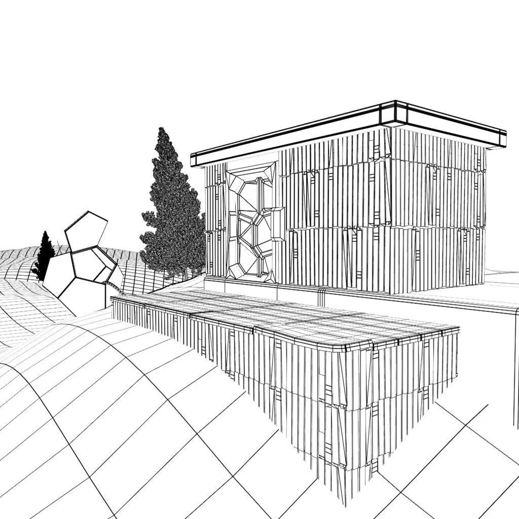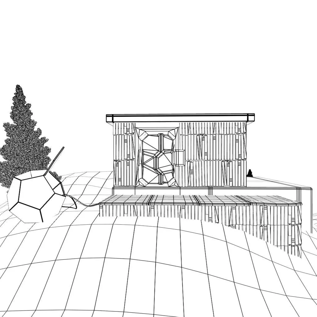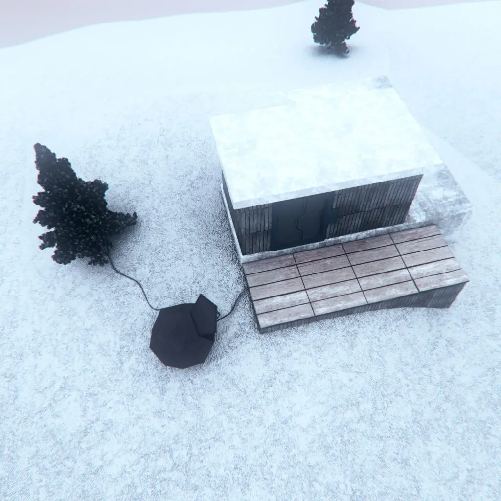 A simple scene containing a wooden cabin, trees, a platonic shaped thing and snowy terrain. Tree is seperately zipped for optimizing size.