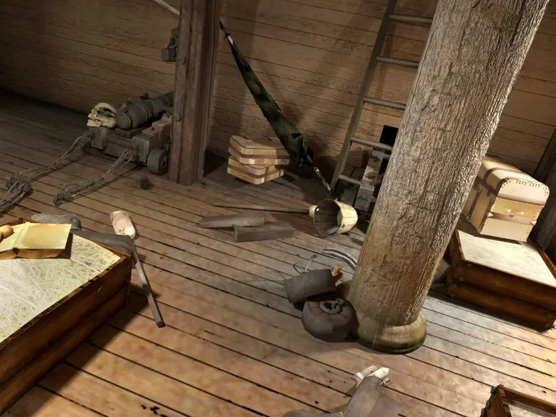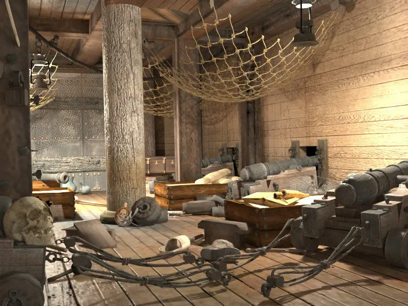 Model pirate ship cabins period until the 18th century. Cabin or vacation, so-called bedroom. Interior cabins close to the original at the time. All items correspond to the period of pirates, treasure gun battleship.
