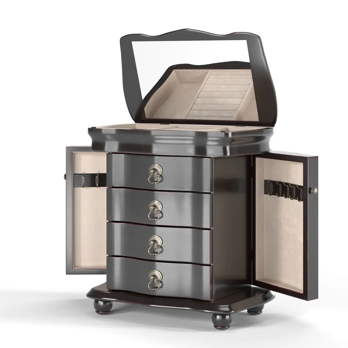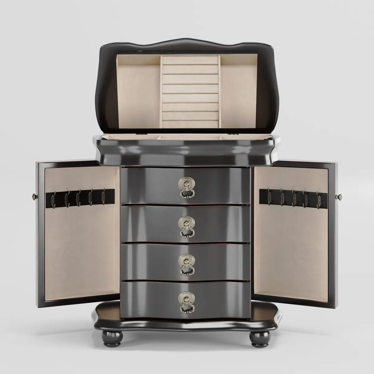 A wonderful model of The Jewelry Box almost 15.5 inches tall with 4 pull out drawers lined with bright anti-tarnish felt, divided compartments. Open the lid to reveal a vanity mirror and ring rolls. Each side features a side panel doors with 5 necklace hooks in each. This model is a dark tree . High quality model.Ready for subdivision.Subdivision 0: poligons - 103457, vertex - 58055Subdivision 1-2(diferens): poligons - 731273, vertex - 315742.Detailed enough for close-up renders. The model has deep advanced texture maps. Suitable for approximate angles. The files are 3ds Max 2020 and Max 2017. Render done in Corona 4 (2048x 2048).