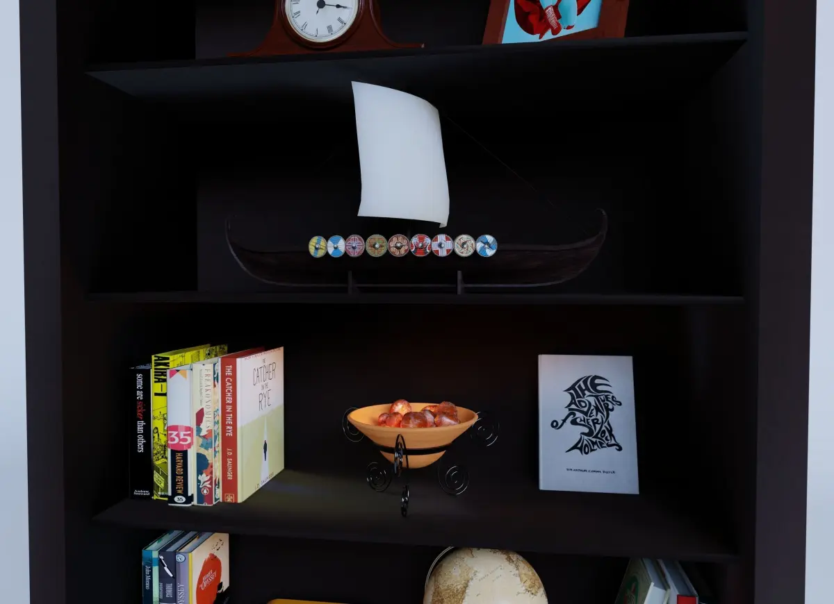1) Cabinet2) + doors variation*3) Antique globe4) Johnny Walker 1.5 liter Black Label with lowball5) Picture frame showing a handsome male specimen6) A bunch of books7) Ashtray8) Award*9) Chest (with interior) with 4k textures in combined specular and metalic workflow created in Substance10) Buddha figurine11) 70s style radio12) Viking ship, shield textures contributed by Mikael Lav (https://www.artstation.com/haekel)*13) Vintage desk clock, 4k textures*14) salt crystal lamp15) 2k jpeg textures, in which several wood variations for the cabinet, made in Substance and procedural and thus usable in your other projects