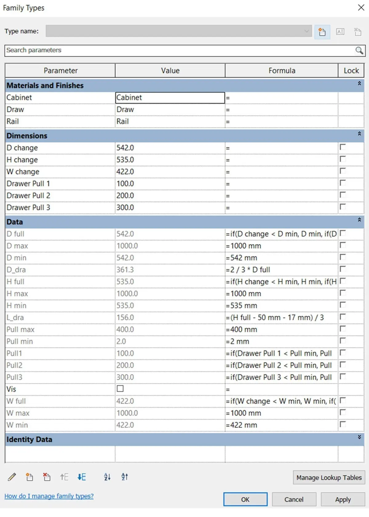 Family's was created in Revit 2017 (predominantly )Have parametter inside:Can change length, width, height, open and close the door, pull 3 drawers.