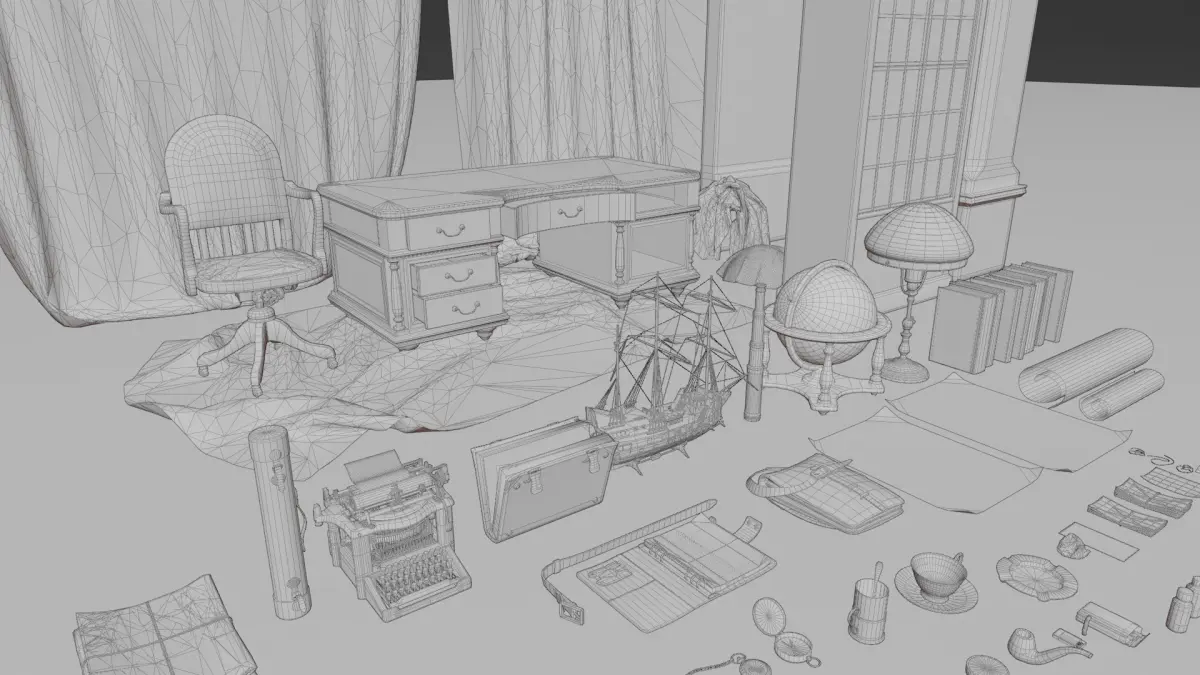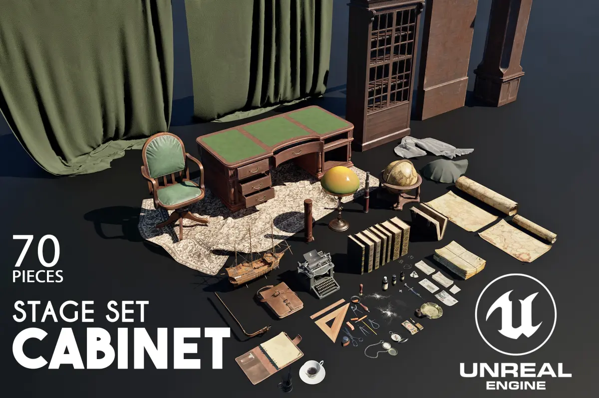 Bring a unique atmosphere to your projects with this highly detailed 3D asset pack featuring a stylish vintage desk. Perfect for games, architectural visualizations, or film productions. Each element has been designed with attention to detail, evoking the spirit of a 19th-century scholar's or writer's study. 70 individual pieces, it meticulously recreates a vintage interior with a luxurious and nostalgic feel. Perfect for games, animations, visualizations, or set design.