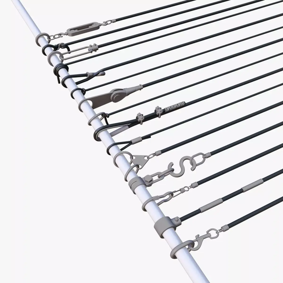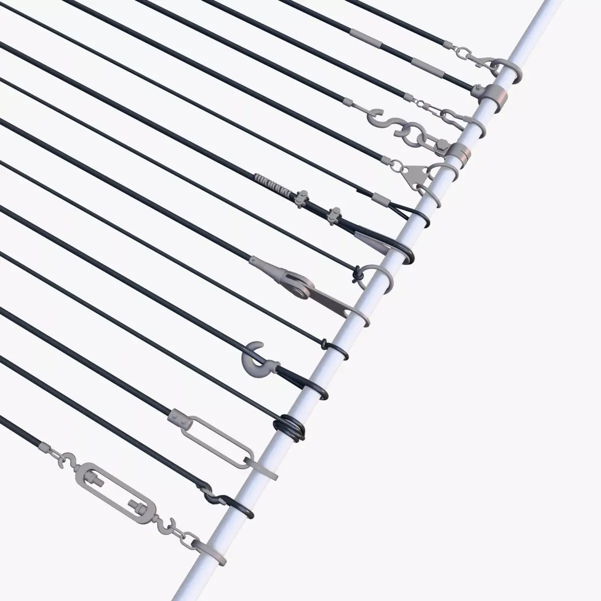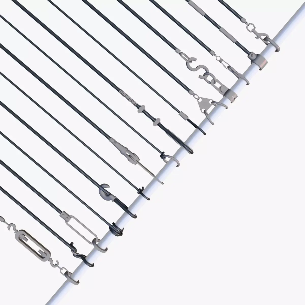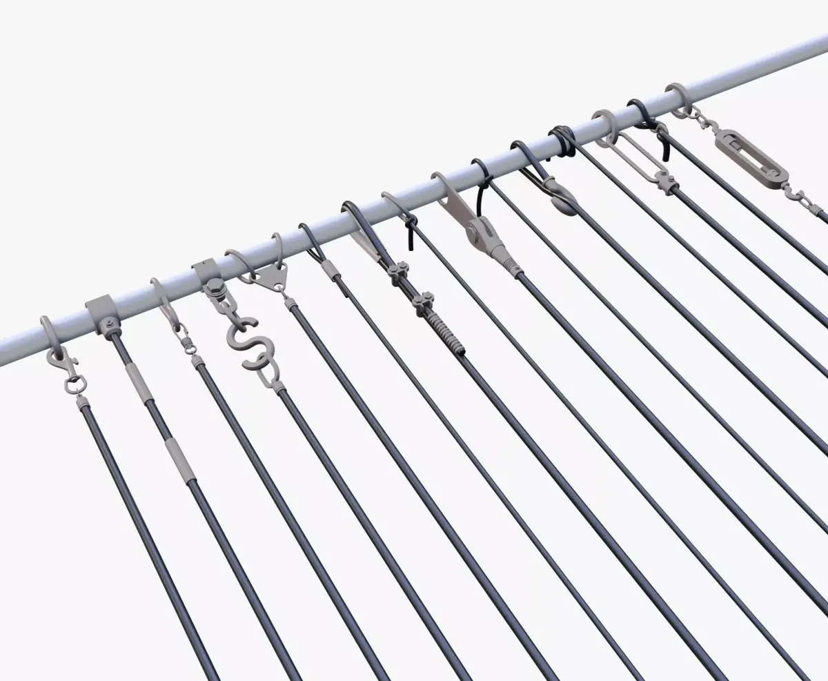 Support rod with a set of cable fastening components, including rings, hooks, clamps, and connecting elements. The construction showcases various types of tensioners and mounting devices for cables and wires.