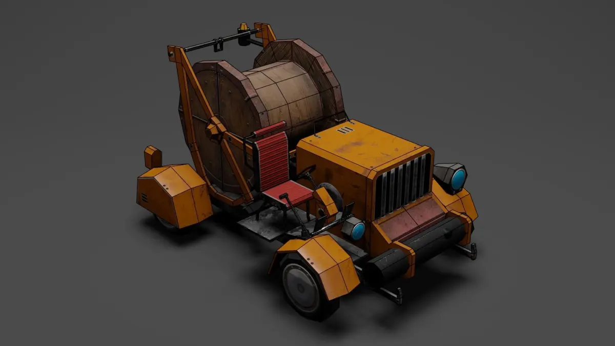 3d model of a cable laying machine with an empty borough. In style lowpole model. The product contains textures and consists of elements divided into three groups. The model is made in blender 3.4.1 and has 1276 polygons and 1552 vertices. The kit includes textures containing color, roughness, metallic and normals.