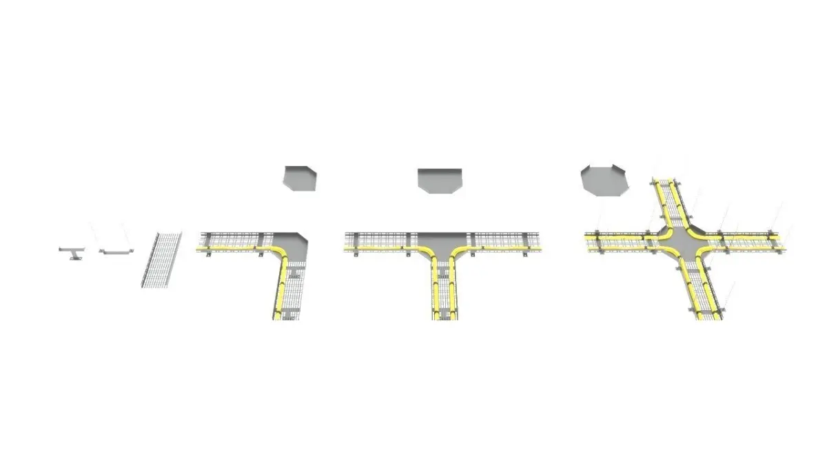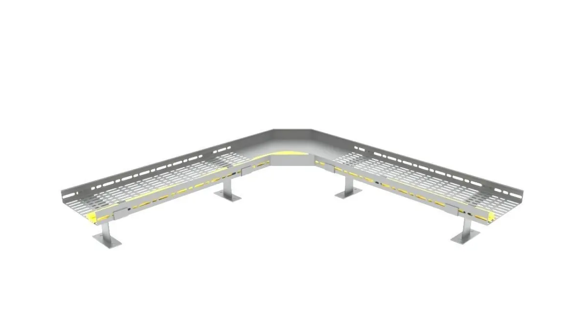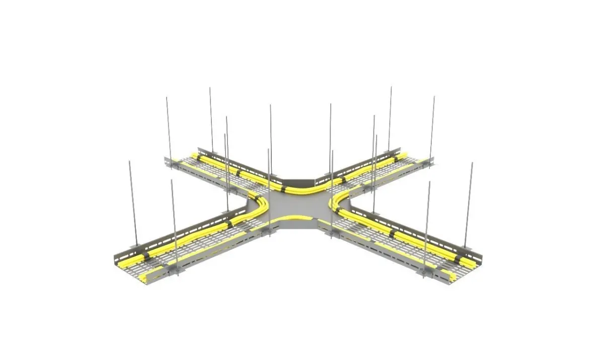 This 3D model features a 600mm x 200mm cable tray, including various junction components such as T-junctions, L-junctions, and cross-junctions. Additionally, it contains supporting profiles for both ceiling and floor installations. An example cable route is also included within the model.