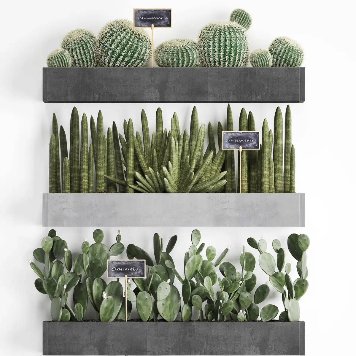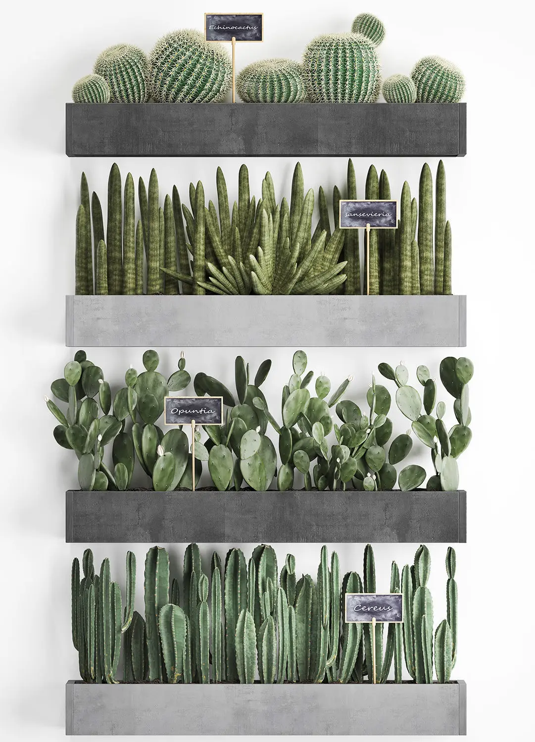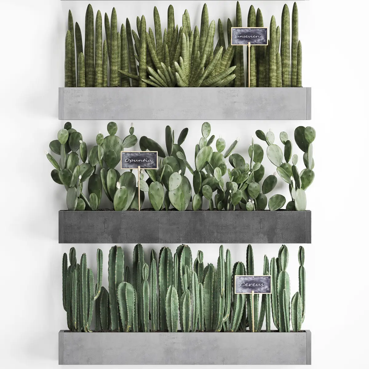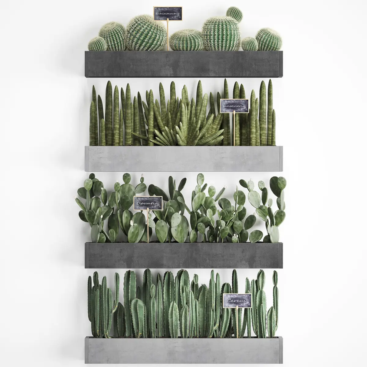 Collection of ornamental plantsExotic plantsHouseplantsCactusCereus repandusColumn CactusSaguaro cactusCarnegiacleistocactusEchinocactusSansevieria cylindricaWooden flower boxeswall decorvertical gardenSubpilocereusOpuntia microdasysEuphorbia trigona