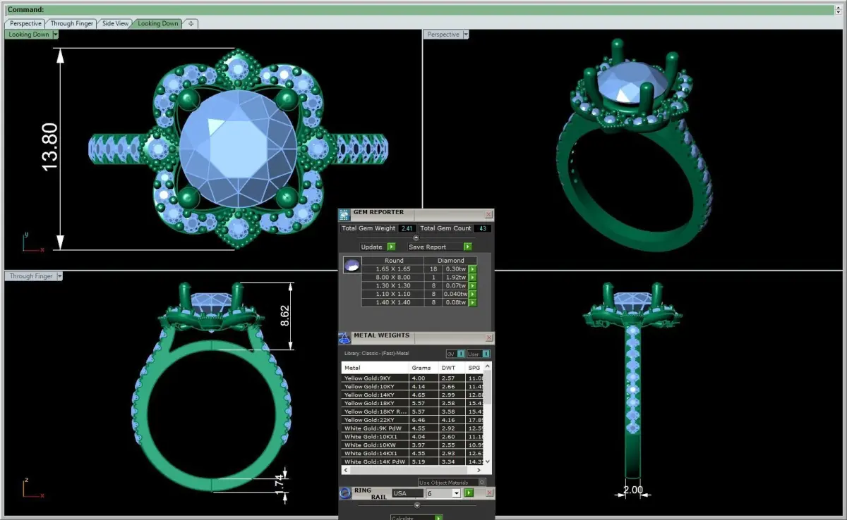 Ring Size Gold Metal Weight in dfferent Karats like 14k, 18k, 22k Gem Stone weight ( Carat Weight ) for all stones in the Model also Quantity of Stones. Dimensions of the Model in mm (millimeter) unit. Delivery Contains 11 files as following :