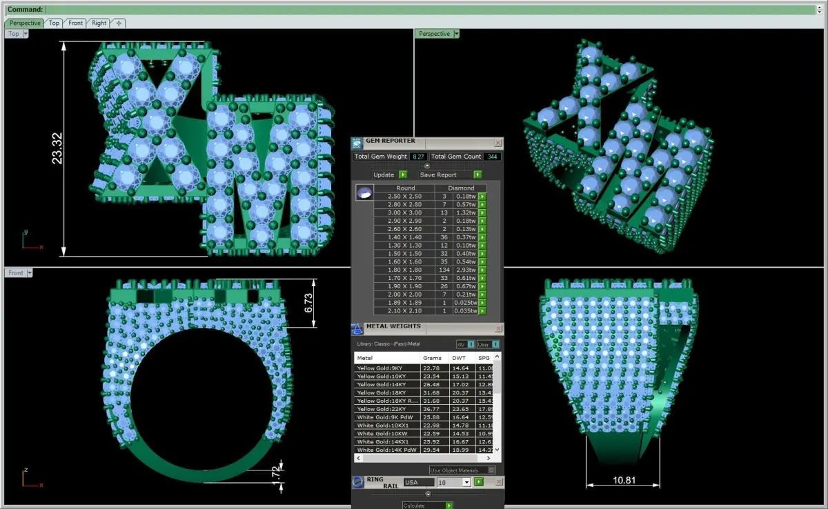 Ring Size Gold Metal Weight in dfferent Karats like 14k, 18k, 22k Gem Stone weight ( Carat Weight ) for all stones in the Model also Quantity of Stones. Dimensions of the Model in mm (millimeter) unit. Delivery Contains 11 files as following :