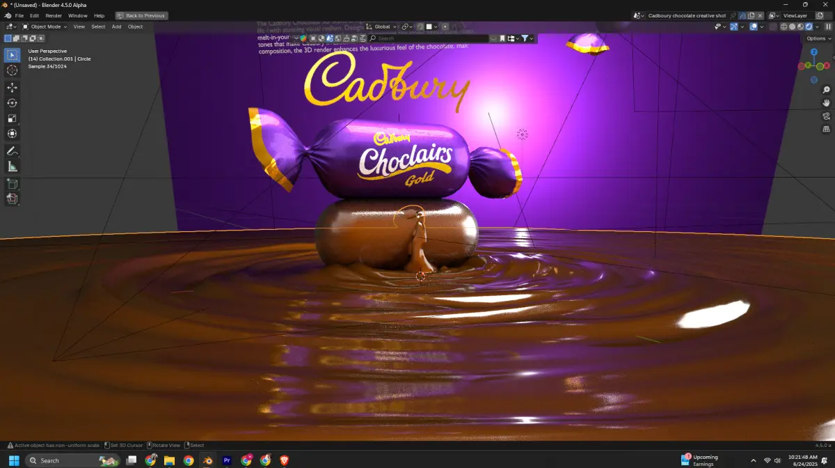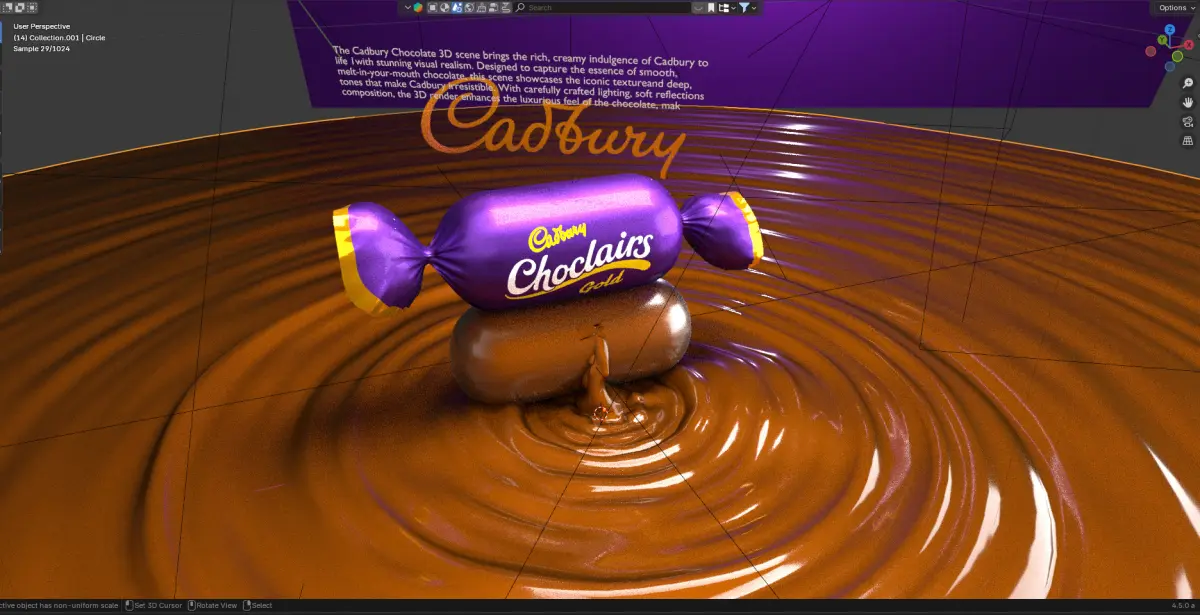 The Cadbury Chocolate Creative Shot 3D Scene is a visually captivating representation of indulgence, crafted to evoke the signature richness and smoothness of Cadbury chocolate. This creative composition blends artistic lighting, fluid forms, and luxurious textures to highlight the essence of the brand—creamy, delightful, and irresistibly smooth. From the glossy chocolate swirls to the elegant layout and color palette, every element is designed to enhance the premium feel of Cadbury. Perfect for advertising, product showcases, or brand storytelling, this 3D scene transforms a simple chocolate bar into an immersive and mouth-watering visual experience.