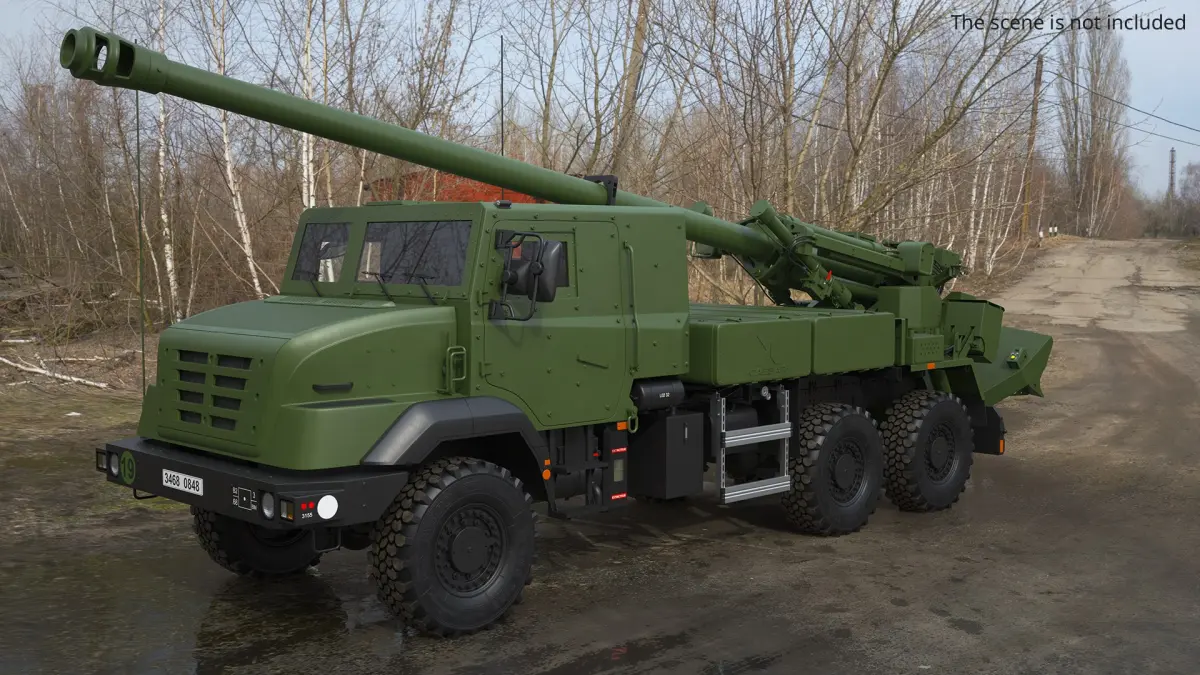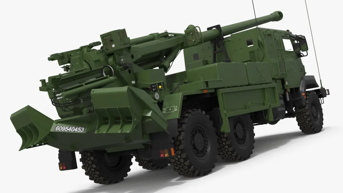The model accurately showcases the long-caliber 155 mm howitzer integrated onto the armored truck chassis. Details include the reinforced cab with protective armor plating, rugged off-road wheels, and the rear-mounted gun system equipped with recoil support structures. The vehicle is depicted with antennas, access ladders, and stabilizers, highlighting its operational versatility for rapid deployment and artillery fire missions.