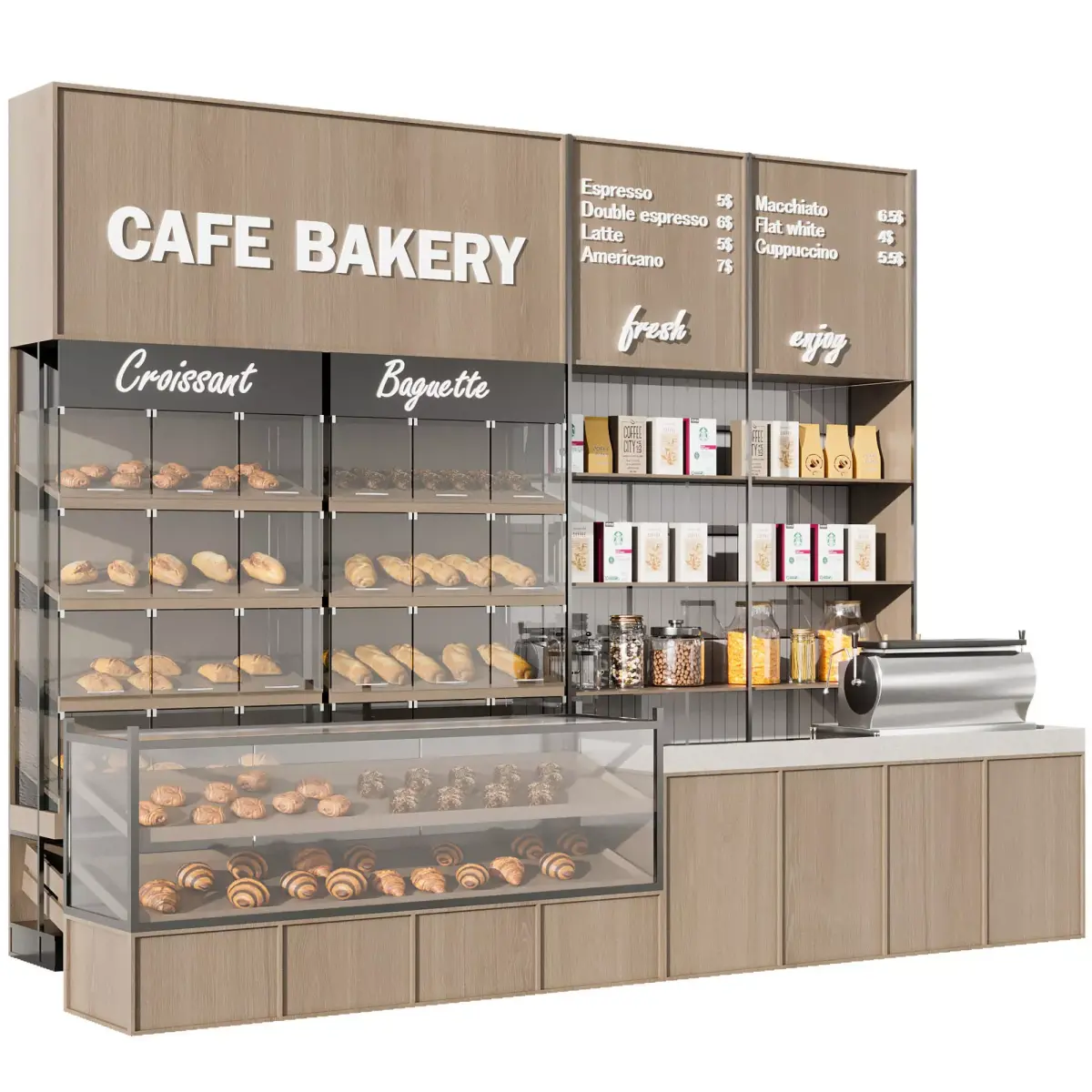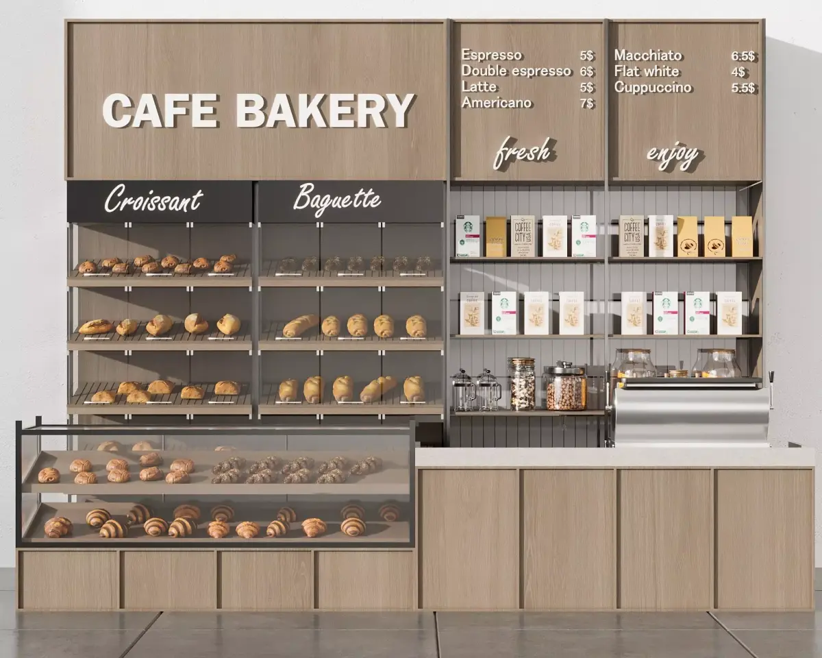 Modern café bakery counter set with wooden façade, pastry display, bread shelves, menu boards and coffee station. The model includes detailed bakery showcases, croissant and baguette racks, coffee packaging, jars and espresso machine, making it perfect for coffee shop interiors, bakery visualization, restaurant scenes, and commercial interior projects.