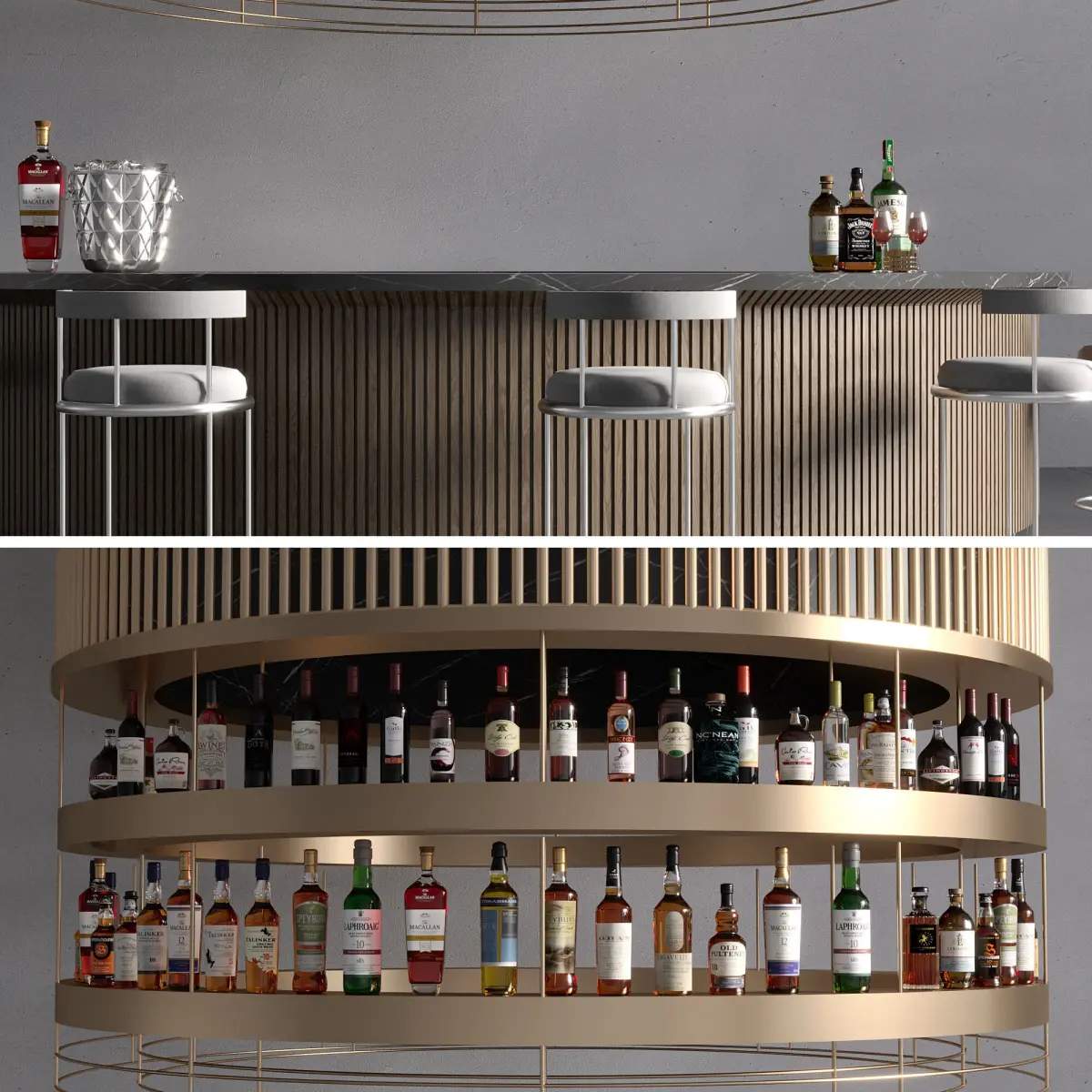 it includes different high poly and detailed objects like chairs,whiskey bottles,wine bottles,bucket,decanter and....
