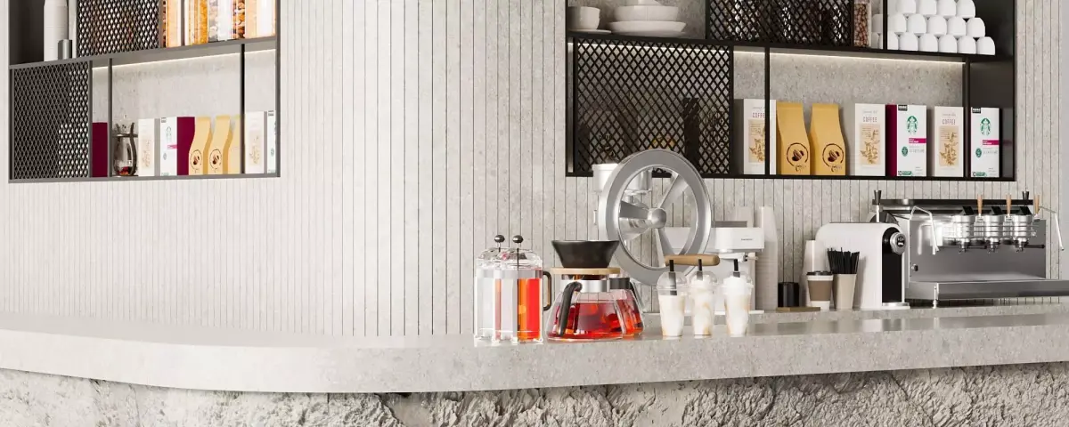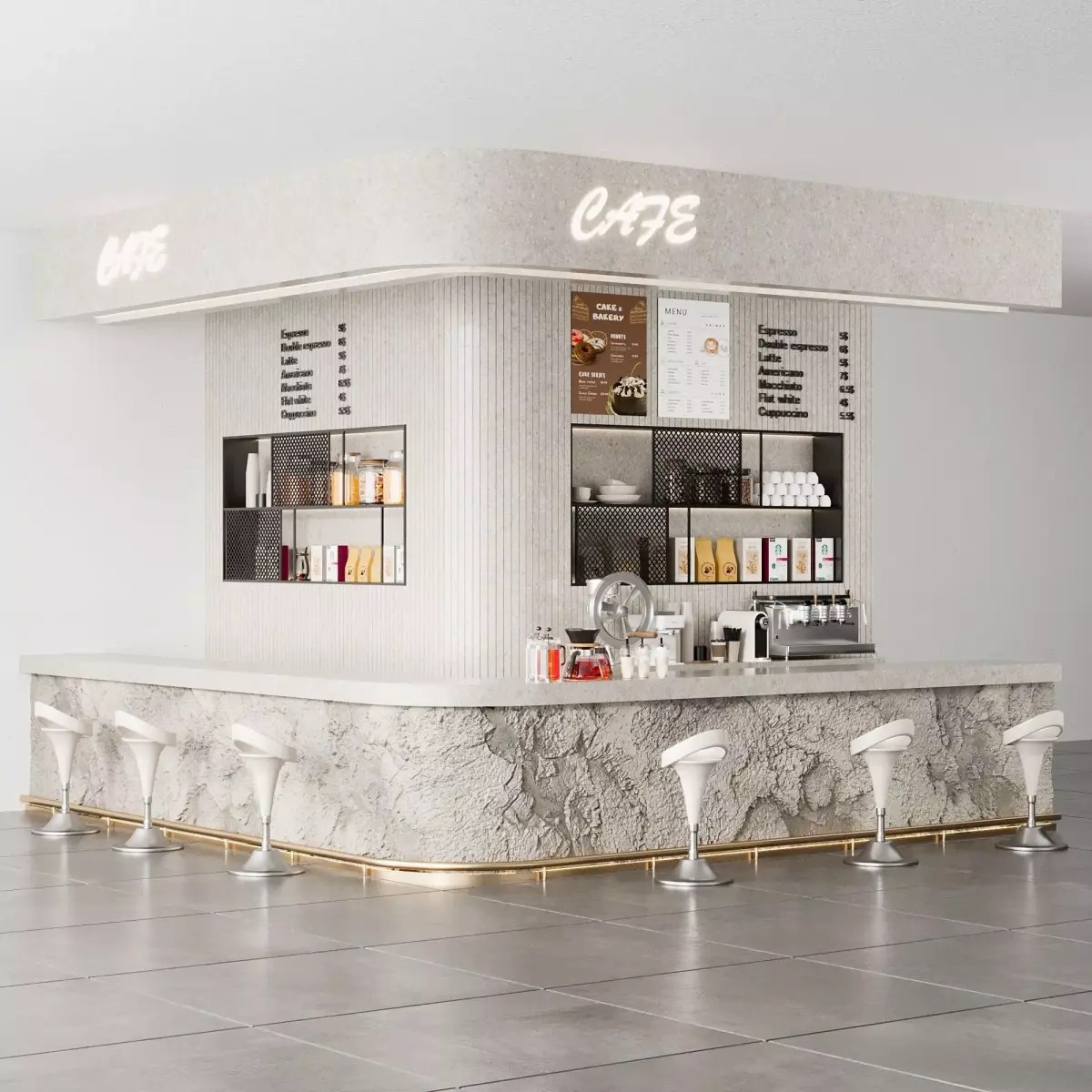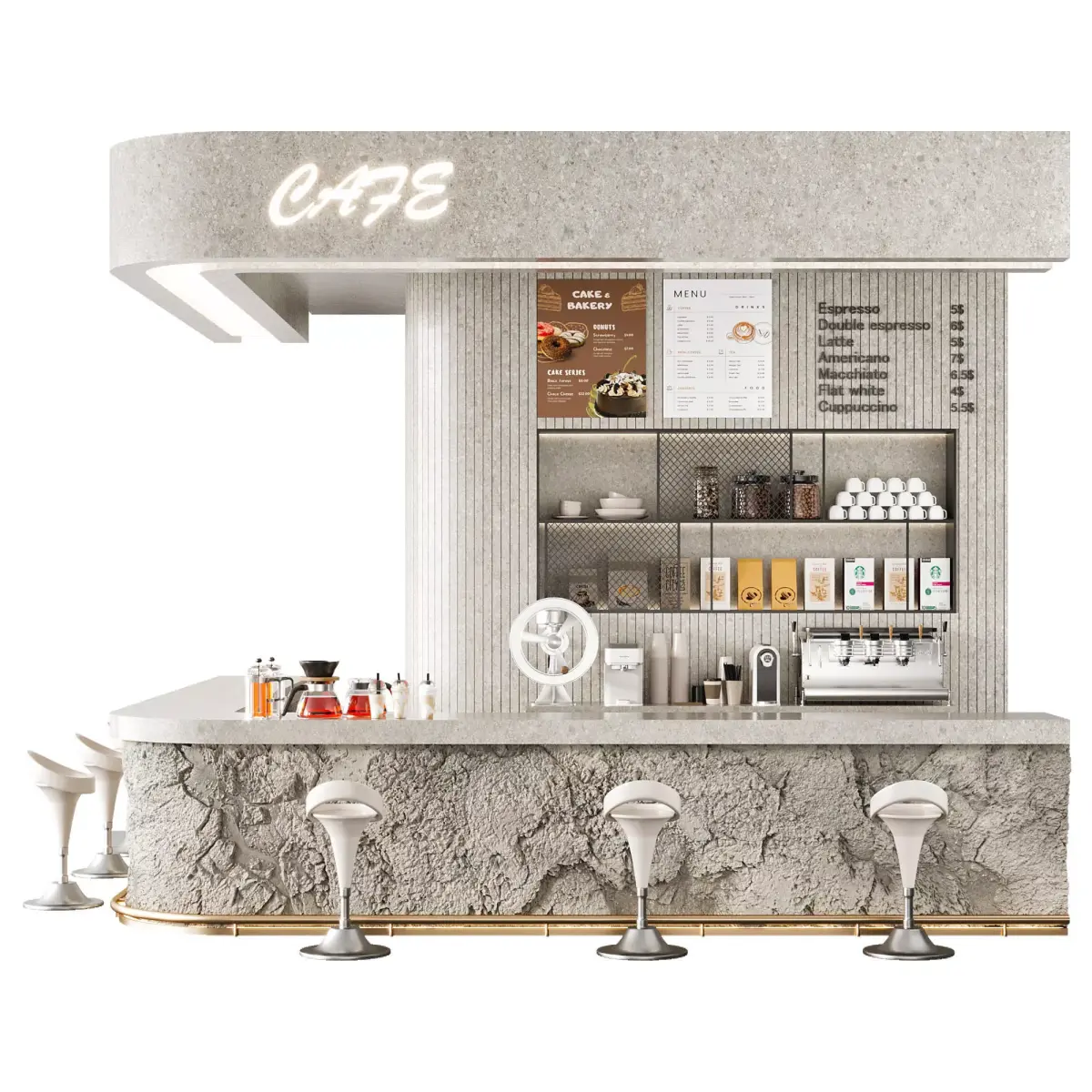 High-quality 3D model of a modern café counter featuring a unique textured stone finish, built-in shelving, professional coffee equipment, and stylish bar stools. This detailed model is perfect for interior visualizations of commercial spaces such as cafes, coffee shops, or hospitality projects.