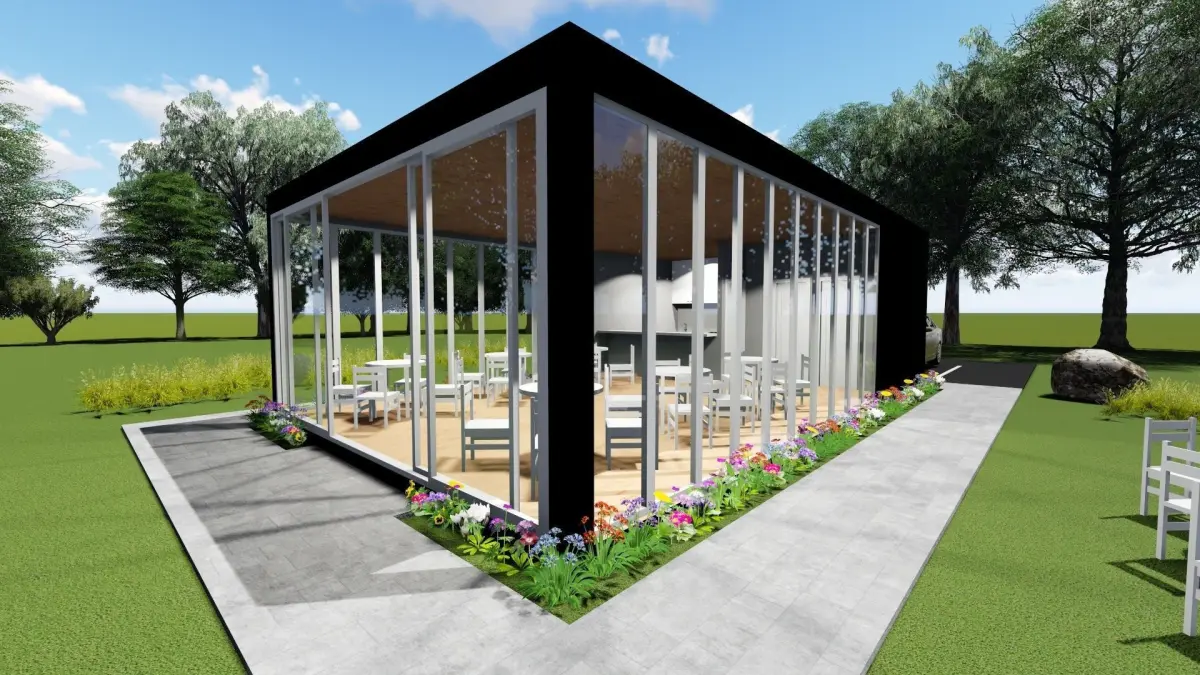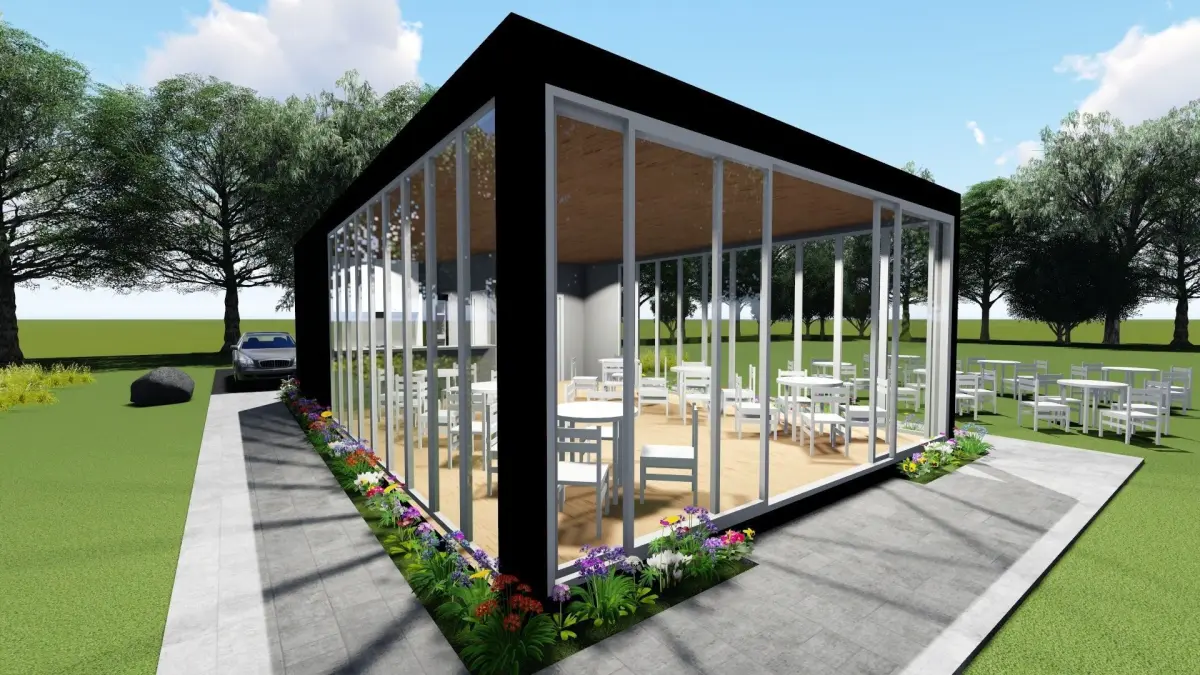 Cafe design with kitchen,toilets, outside tables and car parking place,and has designed in green area.Draw by archicad, rendered and animated with lumion.Files shared.