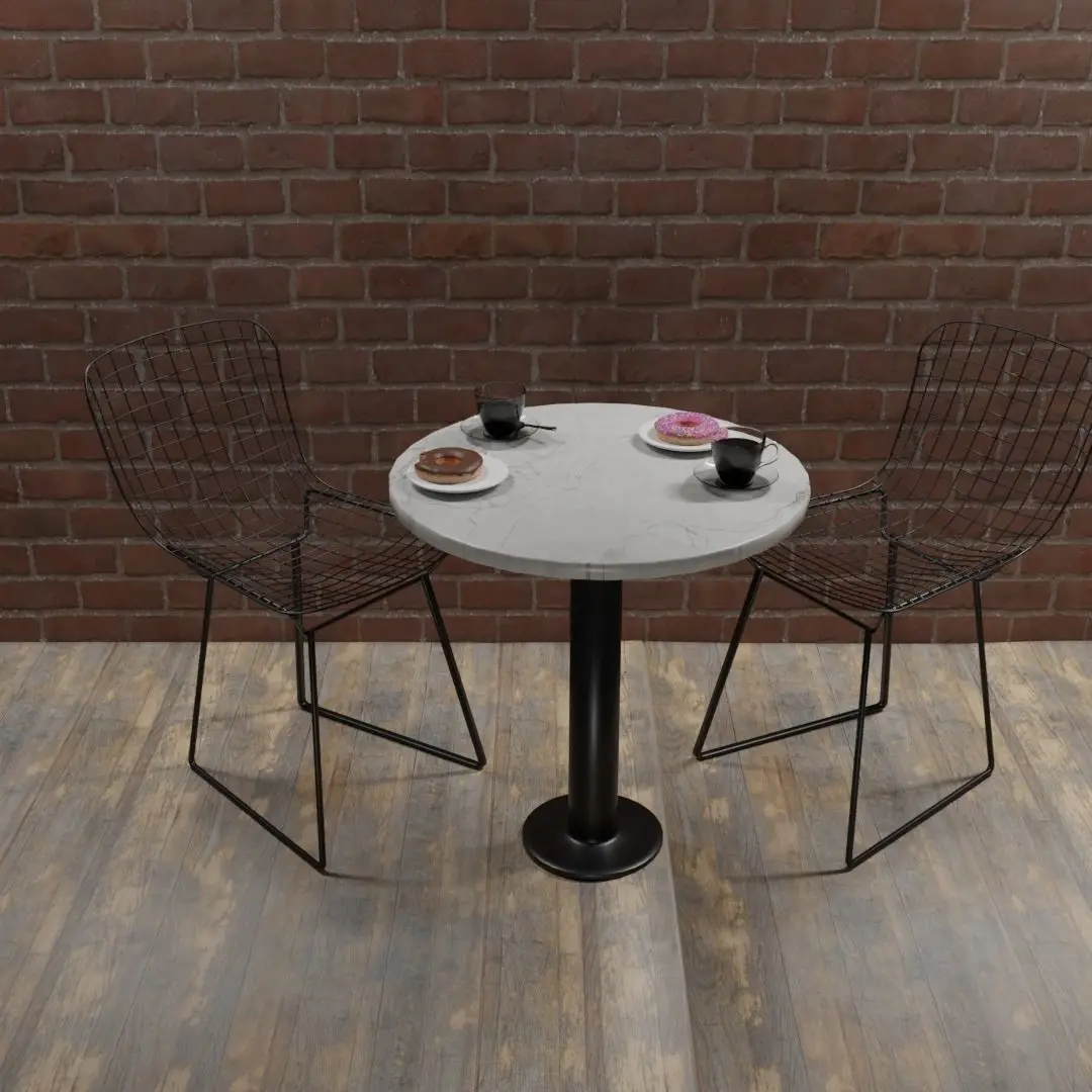 Round marble metal table single leg, Coffee, Glass Coffee Cups top side with steam bubbles, Glass Plate, Spoon, Donuts, Eifel plated metal chair, can be used for interior design. Have fun