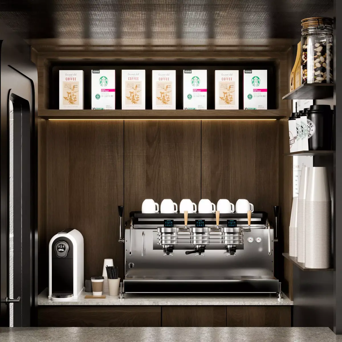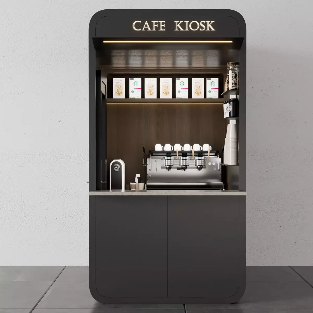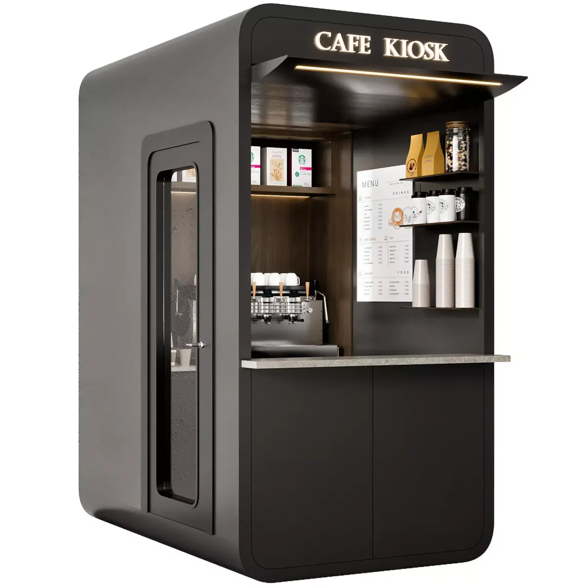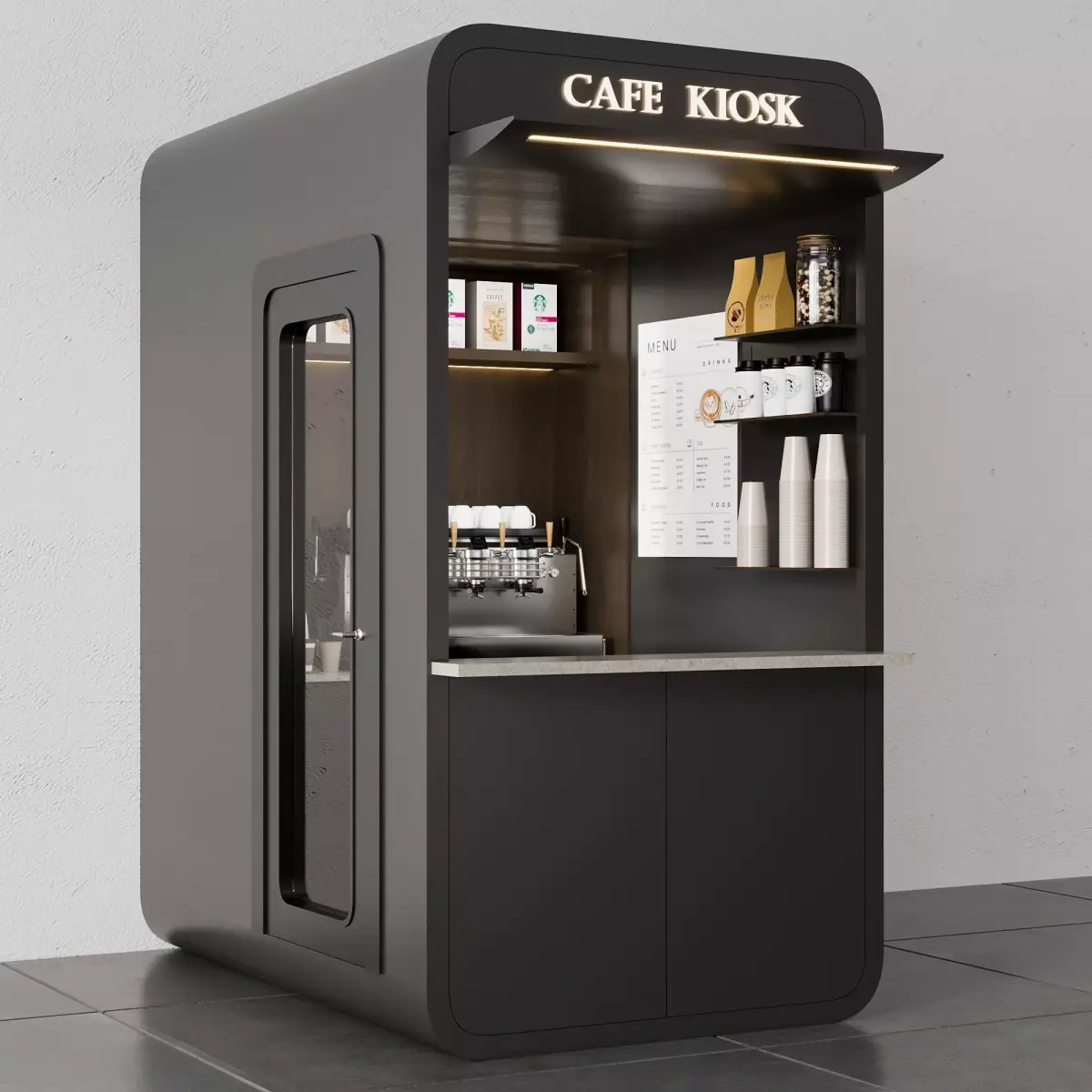 High-quality 3D model of a modern cafe kiosk, perfect for use in commercial interiors, mall environments, or exterior coffee shop concepts. The model includes detailed elements such as a coffee machine, paper cups, shelf items, menu board, and realistic lighting