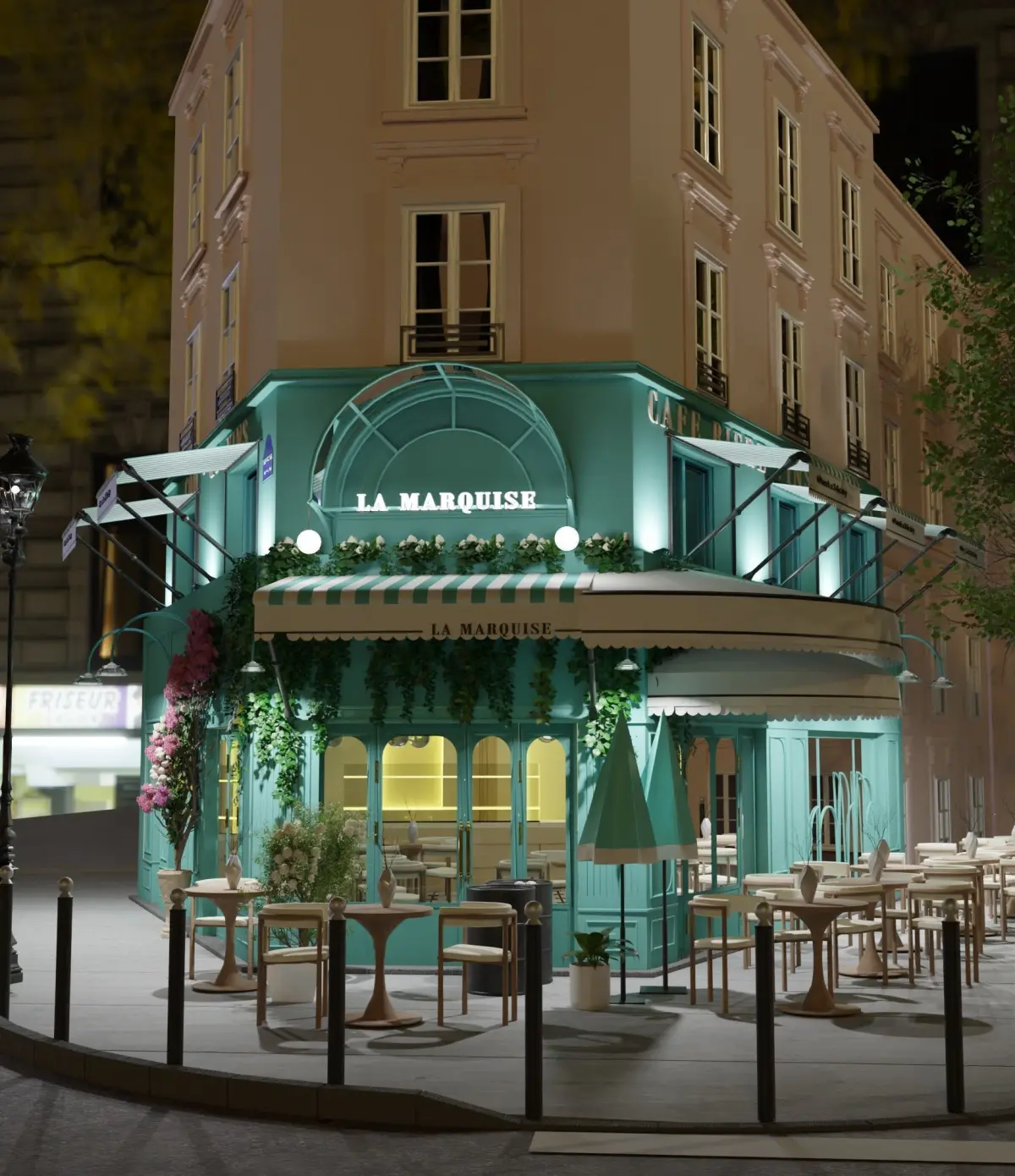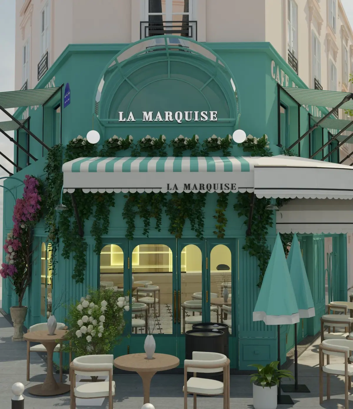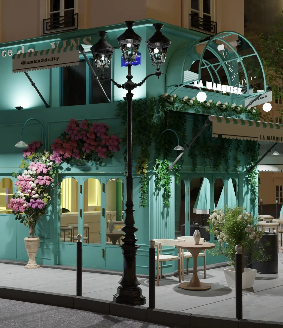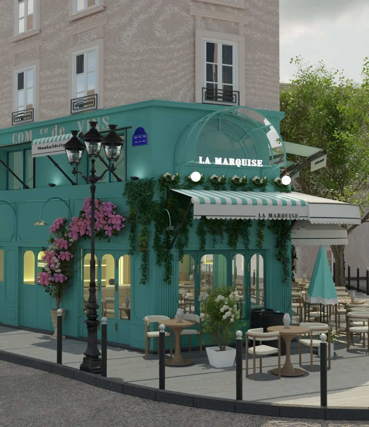 model info (dimensions)cafe villa la marquise parislength1 :3.5 mlength2 :9 mwidth:6 mheight:10 mcolors: Tiffany Blue & Battleship graymaterials:wood la marquise shop in Parishas full uv and unwraping.