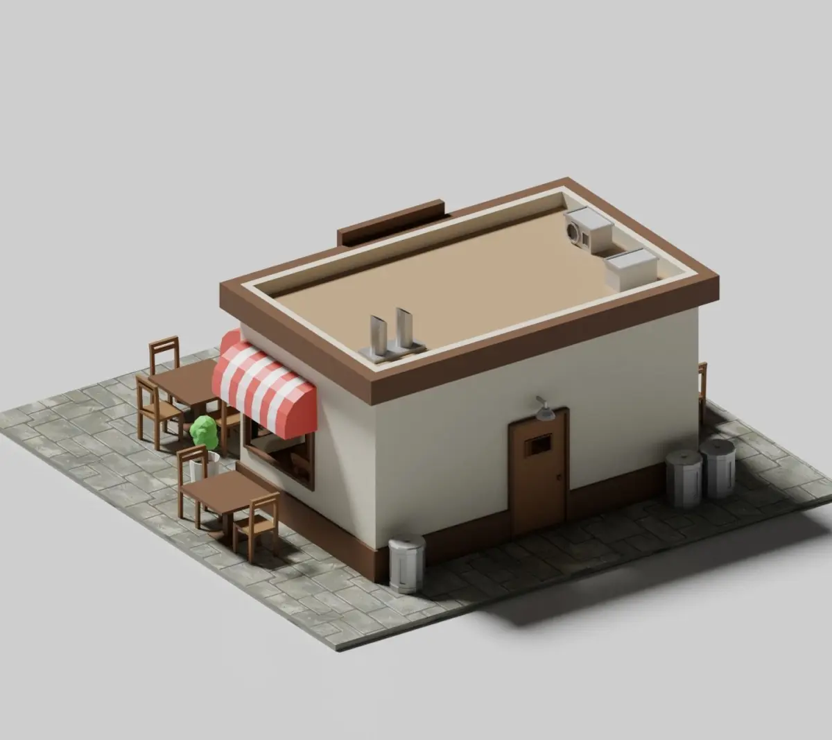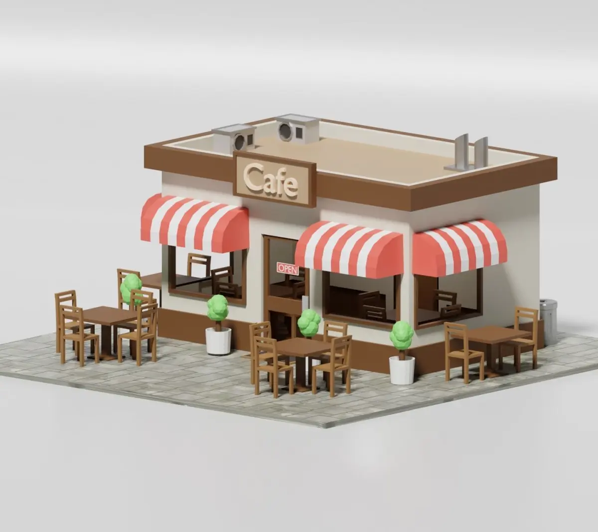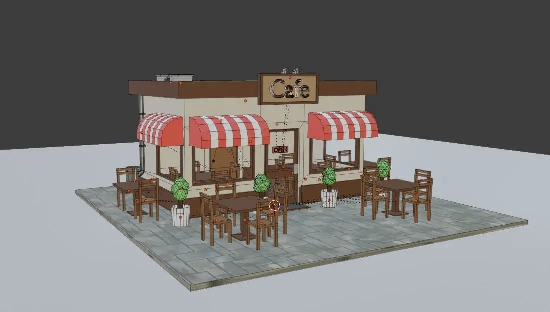 I made a low poly Cafe in Blender. You can use this model for your games or several projects. The project has a cafe building, chairs, desks, and some plants.