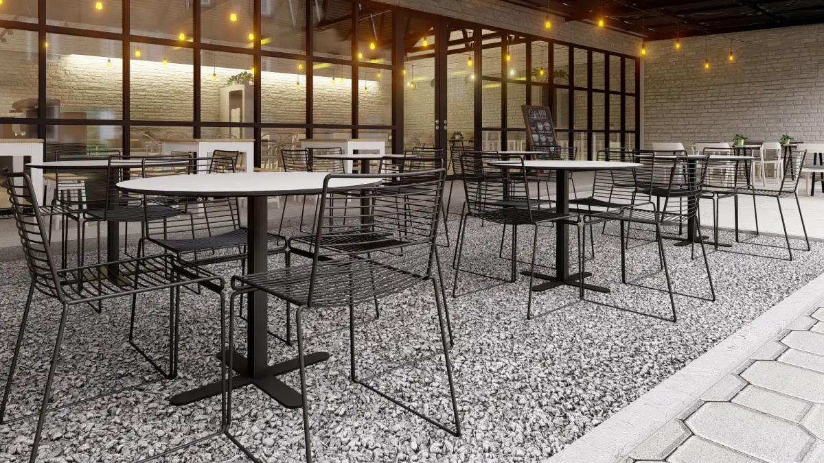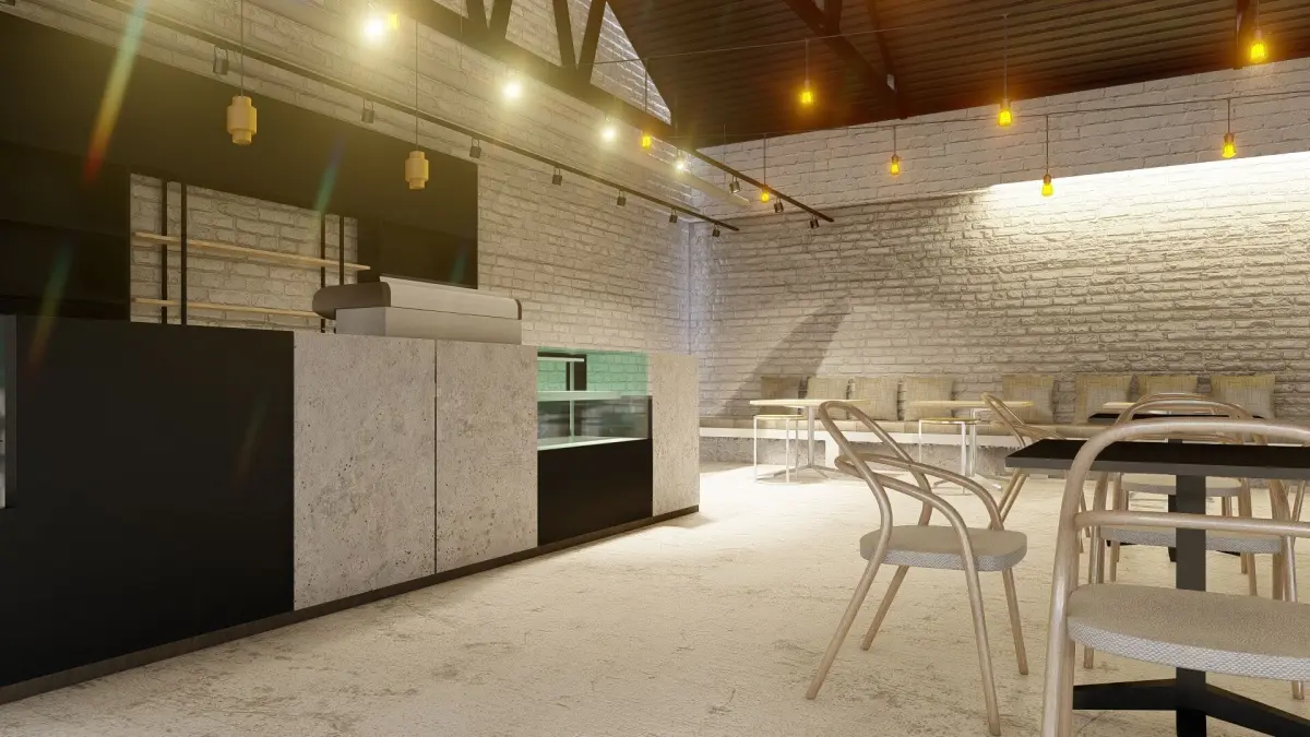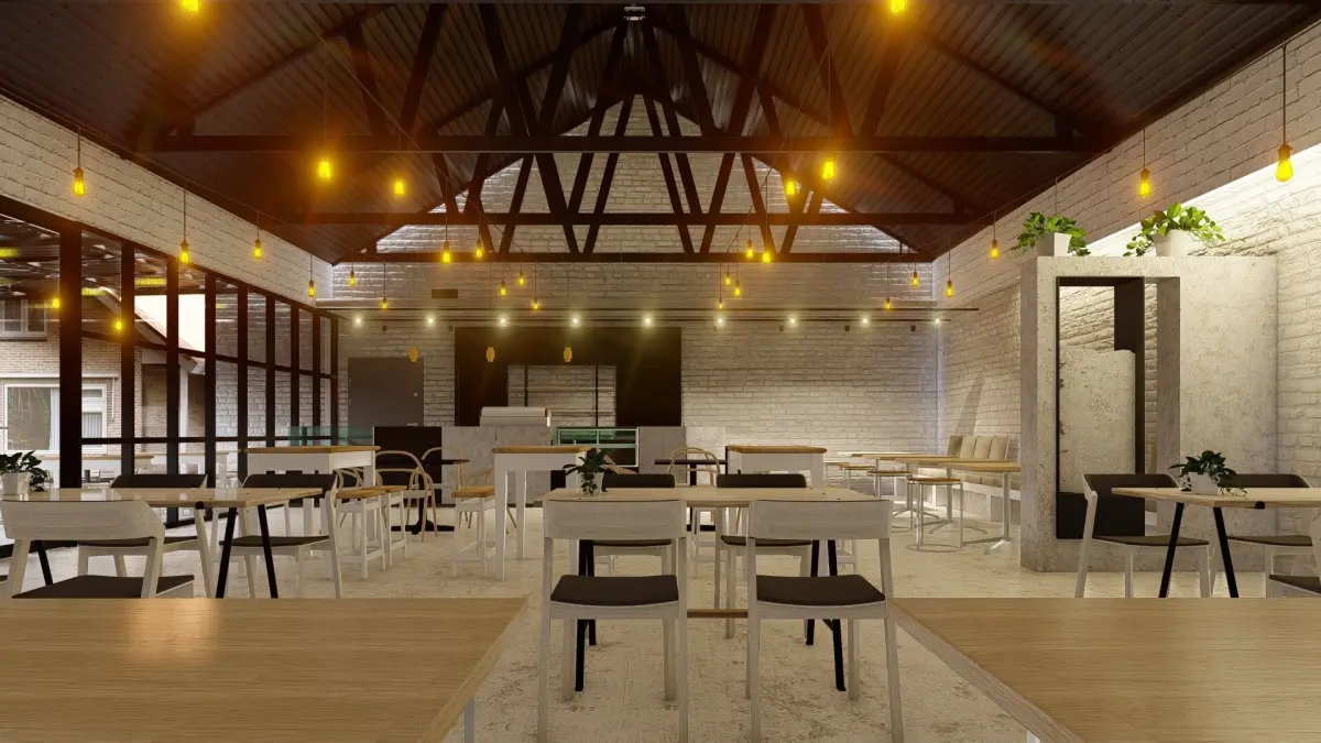 Industrial Cafe interior with natural light installations.