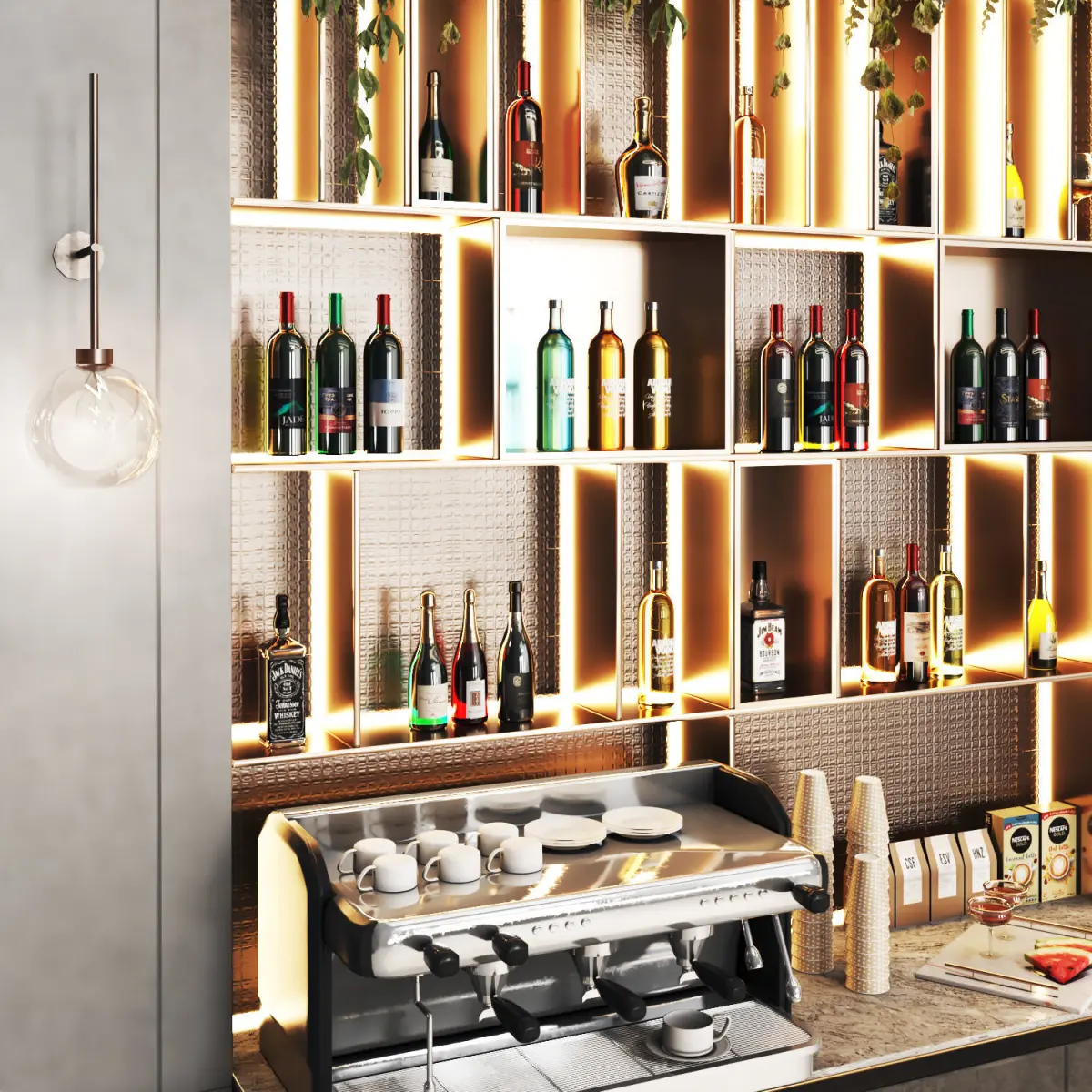 Name: Cafe11Cafe Bar Designing with wine shelf and counter, Workstation Cocktail By Frigomeccanica.Version: 2016Units: CentimetersPolys: 718 338verts: 765320XForm:YesBox Trick: NoModel Parts: 103Render: vray + coronaFormats: 3Ds Max 2016, fbx, obj