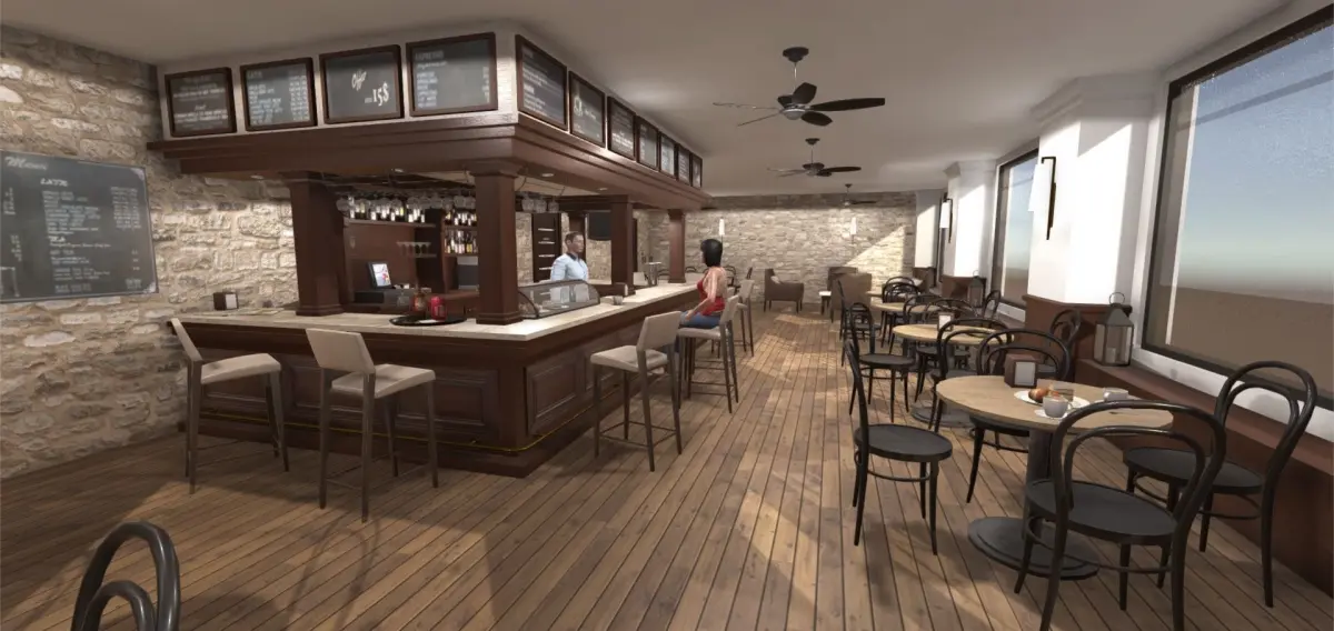 Interior of a classical cafeteria with a European style. There is a total of 57 models of furniture and objects. In the center of the cafe there is a bar with a coffee machine, a till, different types of glasses, plates and coffee cups, pastries, a softdrink can and a beer on an tray There are also two kinds of tables and three different kinds of chairs, a TV set and a newspaper. You can also find different decorative objects like plants, lamps......Two characters also included.