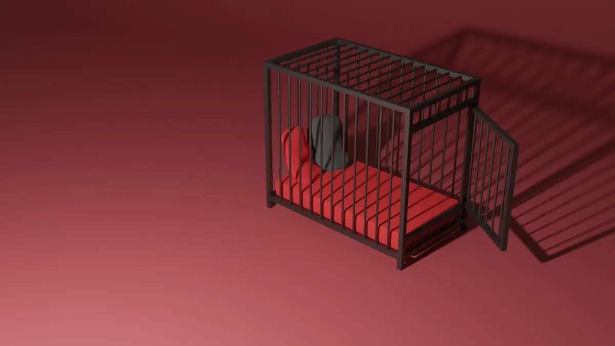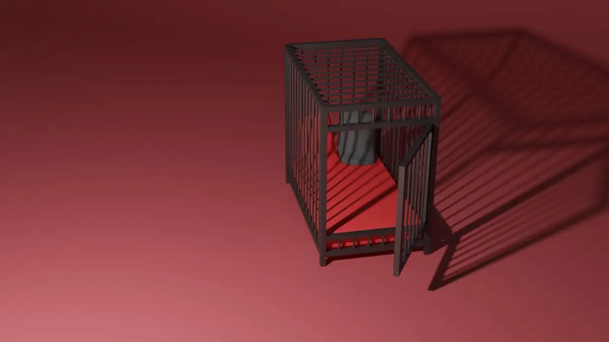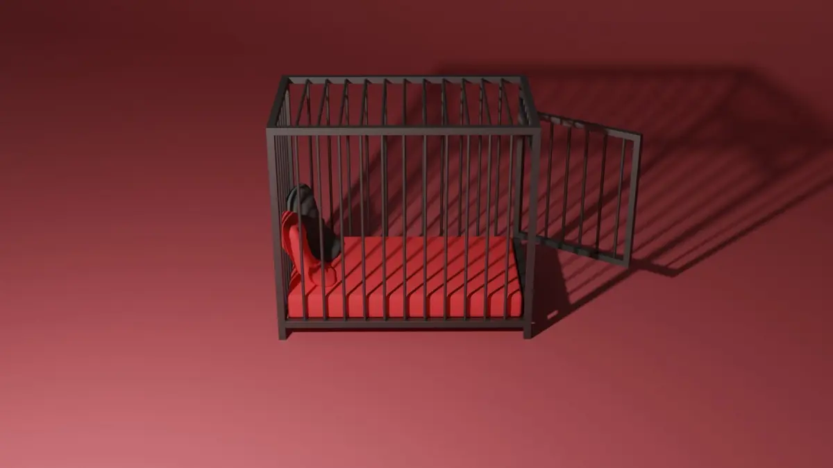 A BDSM bed that is in a cage. The cage has a door that can be opened and closed. The metal is black and the mattres red with a red and a black pillow on the bed. The colors can easily be changed. Perfect for any dungeon. The model is made in Blender 3.0 and rendered in cycles.