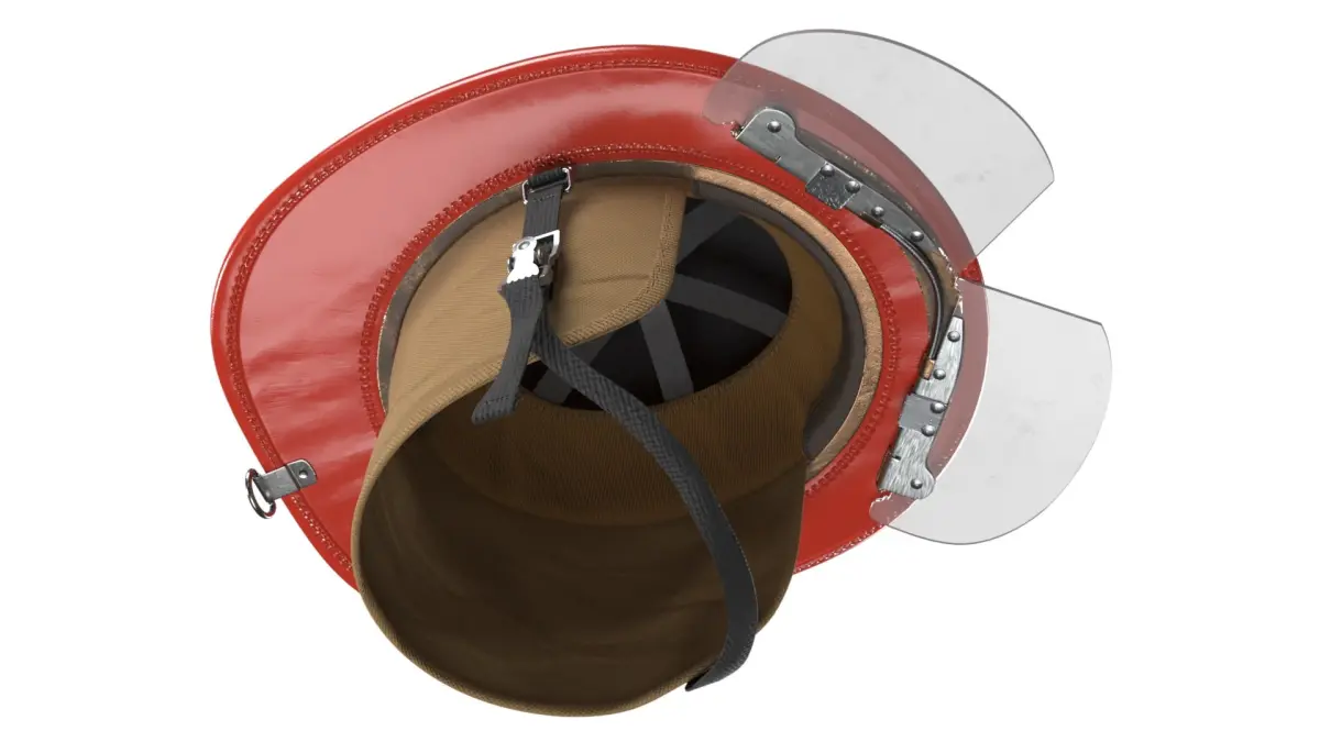 Cairns N5A Firefighting Leather Helmet Red is a three-dimensional model of traditional firefighter helmet, known for its distinctive shape and iconic design.