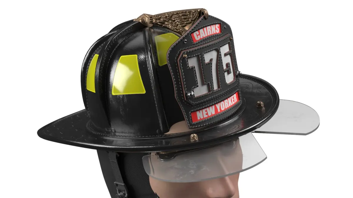 Cairns New Yorker Fire Helmet on Male Head is a three-dimensional model of mannequin with a traditional firefighter helmet, known for its distinctive shape and iconic design.