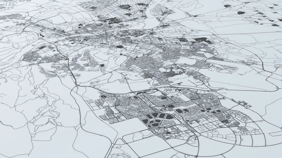 - the model is positioned on a flat surface (road network is on the “floor” - no elevation data included)