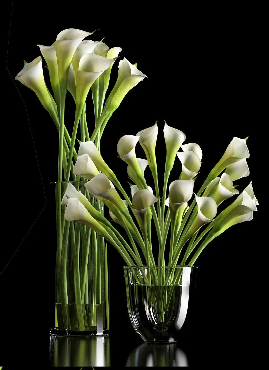 white calla lilies arranged in three different vase suits best interiors, designed in 3dsmax.