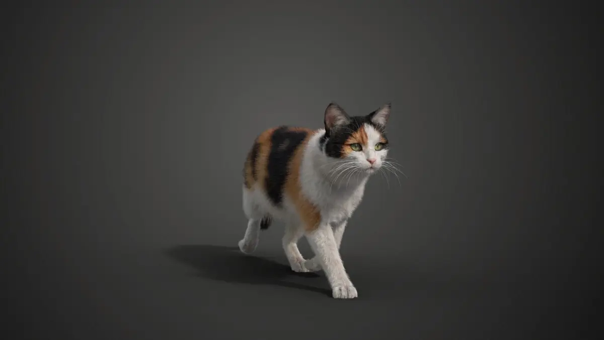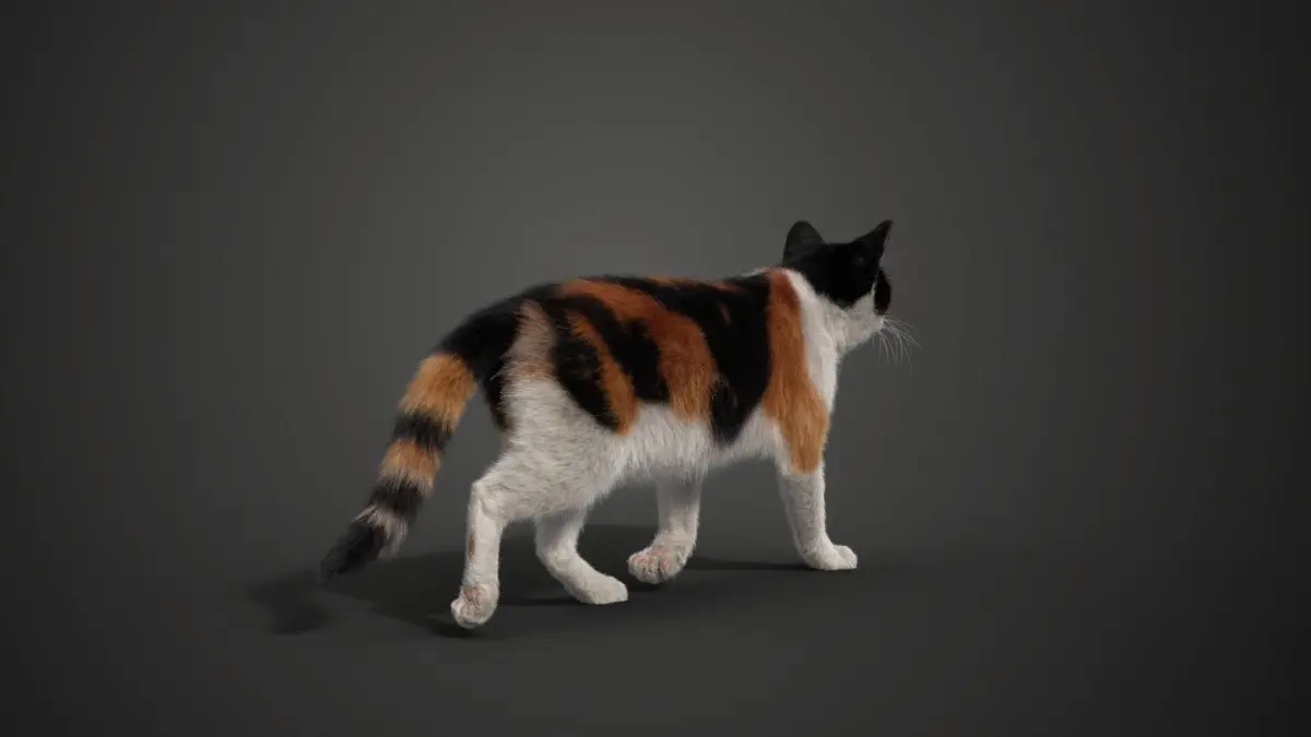 This is a calico cat models have multiple 4K textures (partial UDIM maps), fur, rigging, and 3 animations. The fur maps and skin maps are made separately for a better result. The models are rigged after real bone structure, and with fine facial rigging. They are made with Blender and Cycles renderer at a real-world scale.