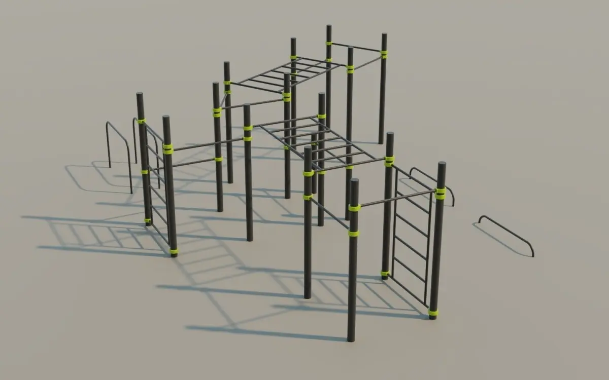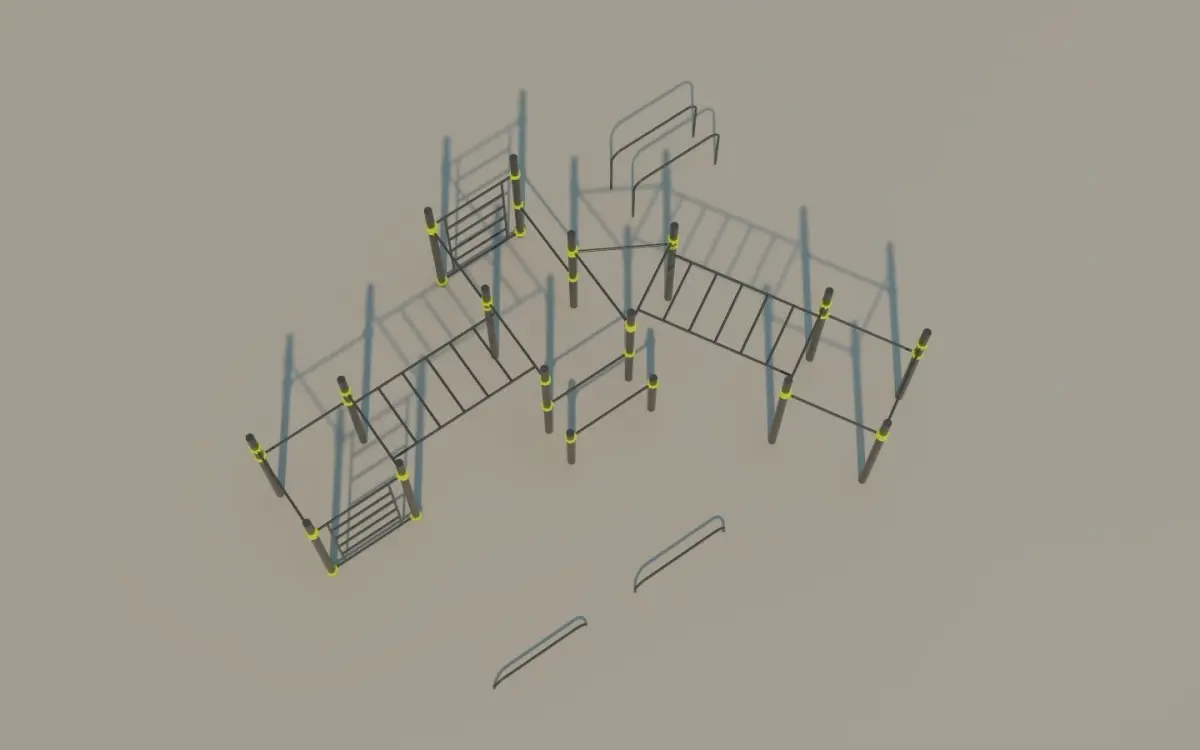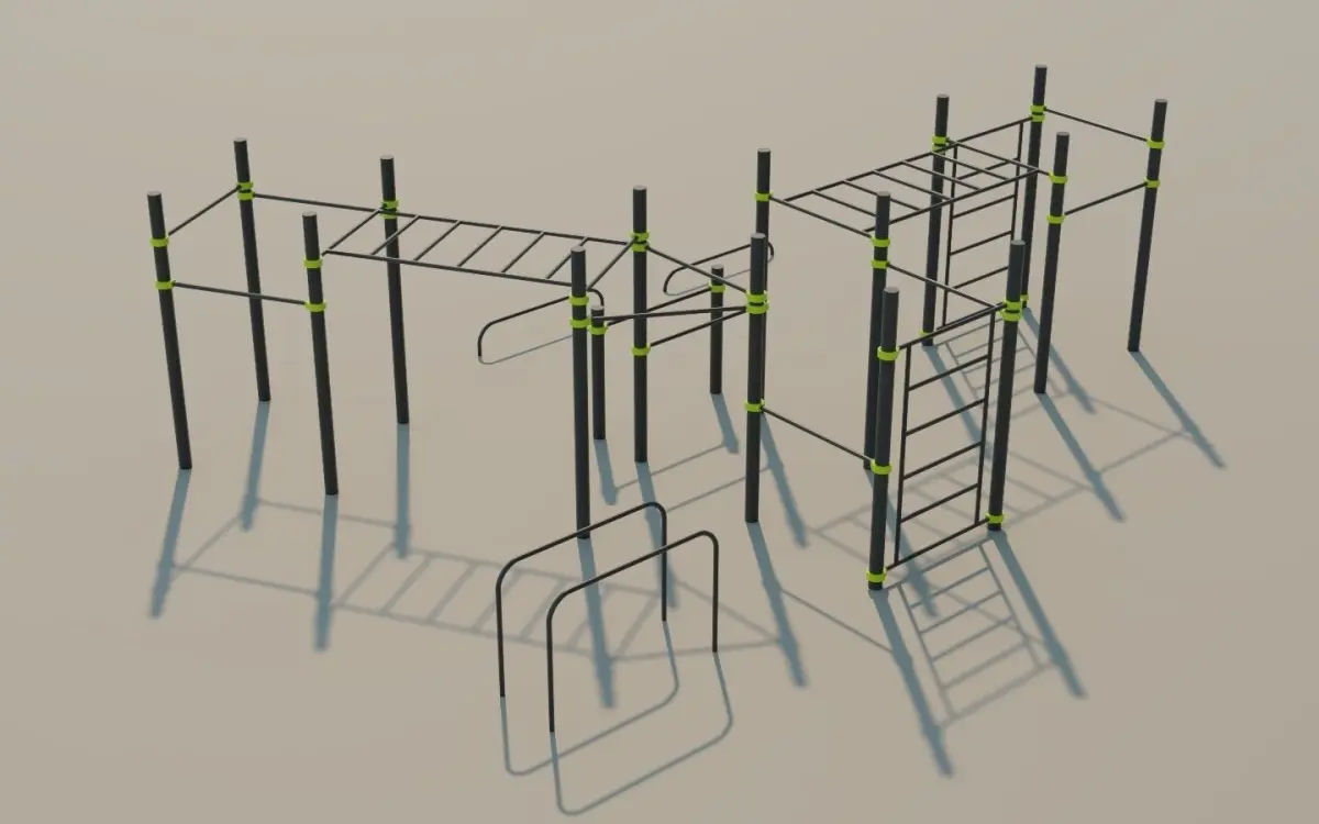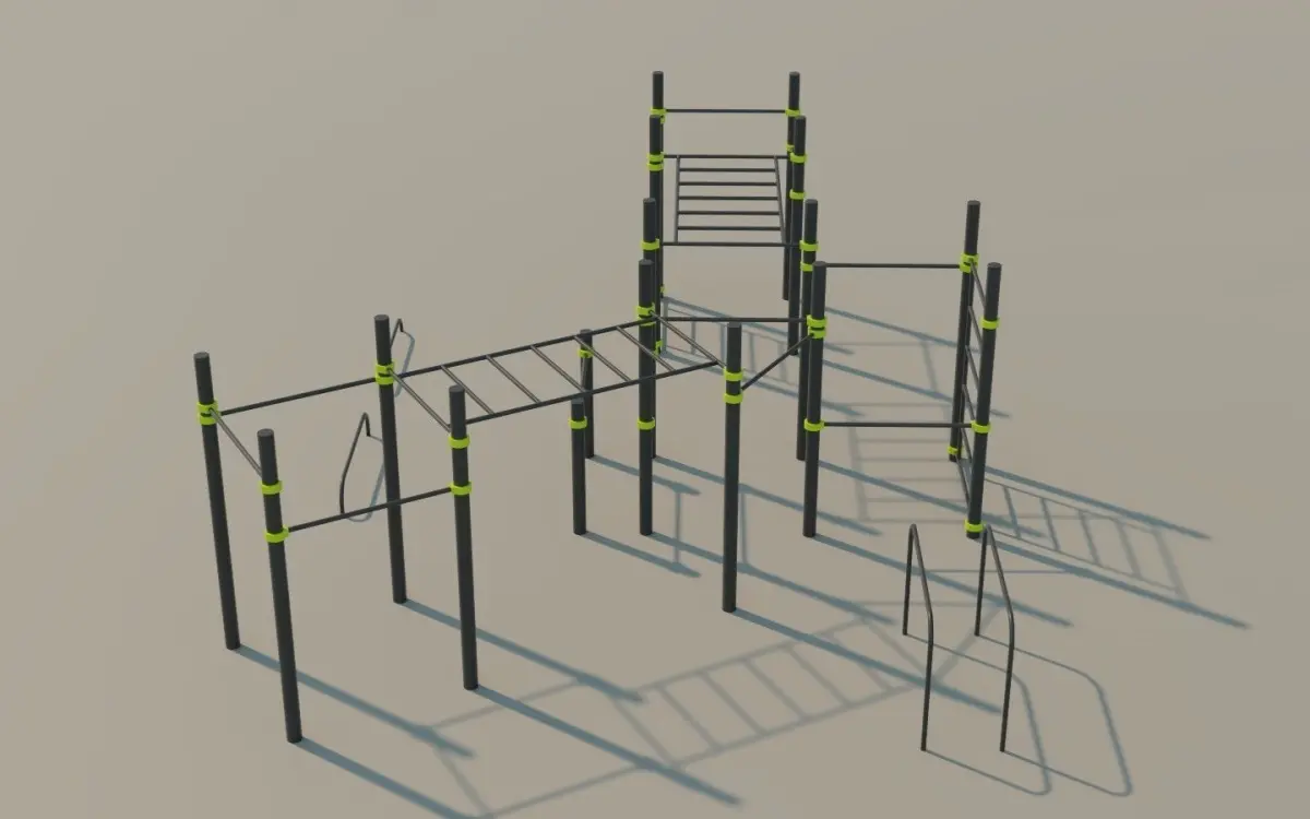 Modern Calisthenics outdoor exercise equipment for parks.Pullup bars of various heights, Parallel Bars, Monkey Bars. This Calisthenic station is ideal for Dips, Pullups, Chinups, Pushups, Muscle Ups and all the basic bodyweight exercises.The 3D model is meant for 3D rendering, archiviz, 3D scenes and not for 3D print.Good level of detail.If you want to reduce the polygon count, open Blend file and disable the bevel modifier on each object.Vertical Poles height: 265cmFull Calisthenics Station dimensions: about 875x650cm