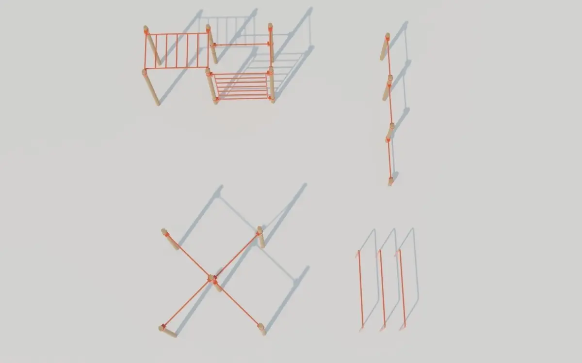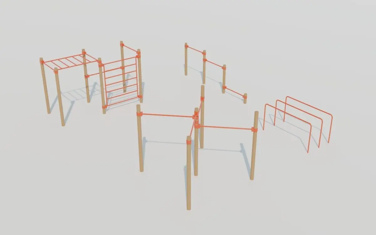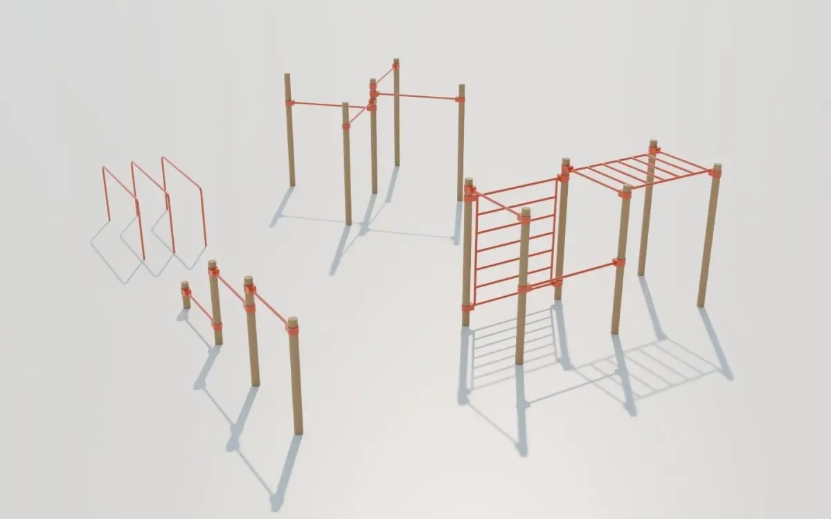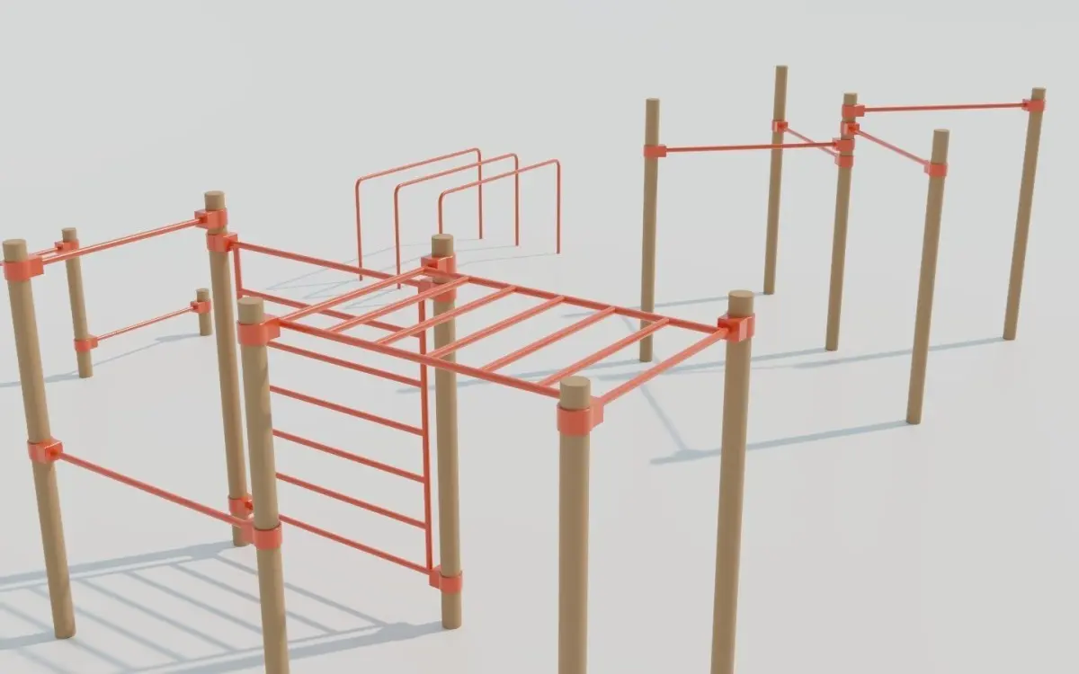 Modern Calisthenics outdoor exercise equipment for parks.Pullup bars of various heights, High bars, Low bars, Parallel bars, Monkey bars. This Calisthenic station is ideal for Dips, Pullups, Pushups, Muscle Ups and all the basic bodyweight exercises.The 3D model is meant for 3D rendering, archiviz, 3D scenes and not for 3D print.Good level of detail.If you want to reduce the polygon count, open Blend file and disable the bevel modifier on each object.Vertical Poles height: 240cmFull Calisthenics Station dimensions: about 730x900cm