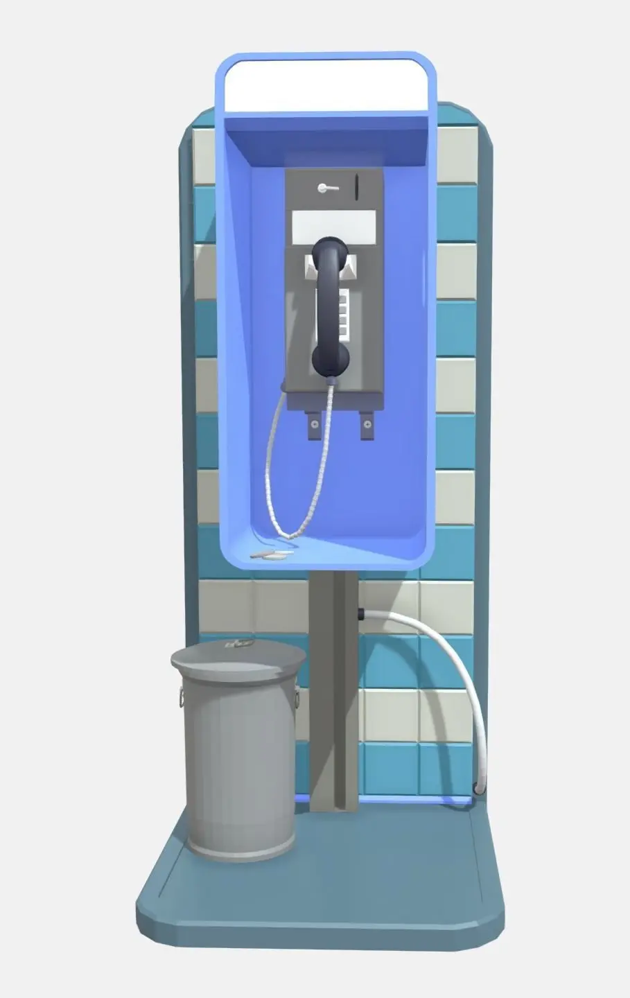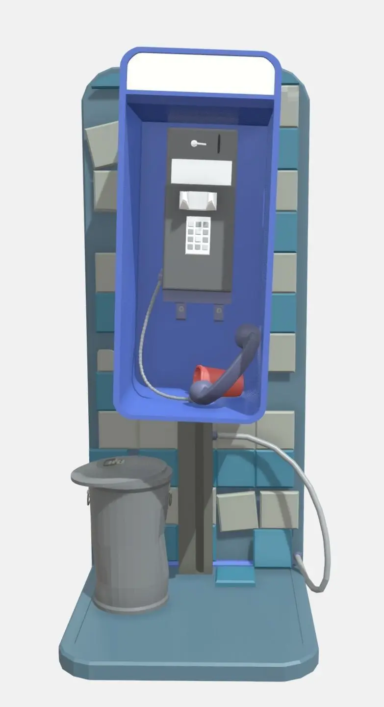 Version 2: The second version of the model depicts a telephone booth that has seen some wear and tear. The glass panels are still intact, but there are a few cracks and chips in the corners. The metal framework is slightly bent in places, and the blue paint is chipped and faded. The phone handset and coin slot have a few scratches and dents.